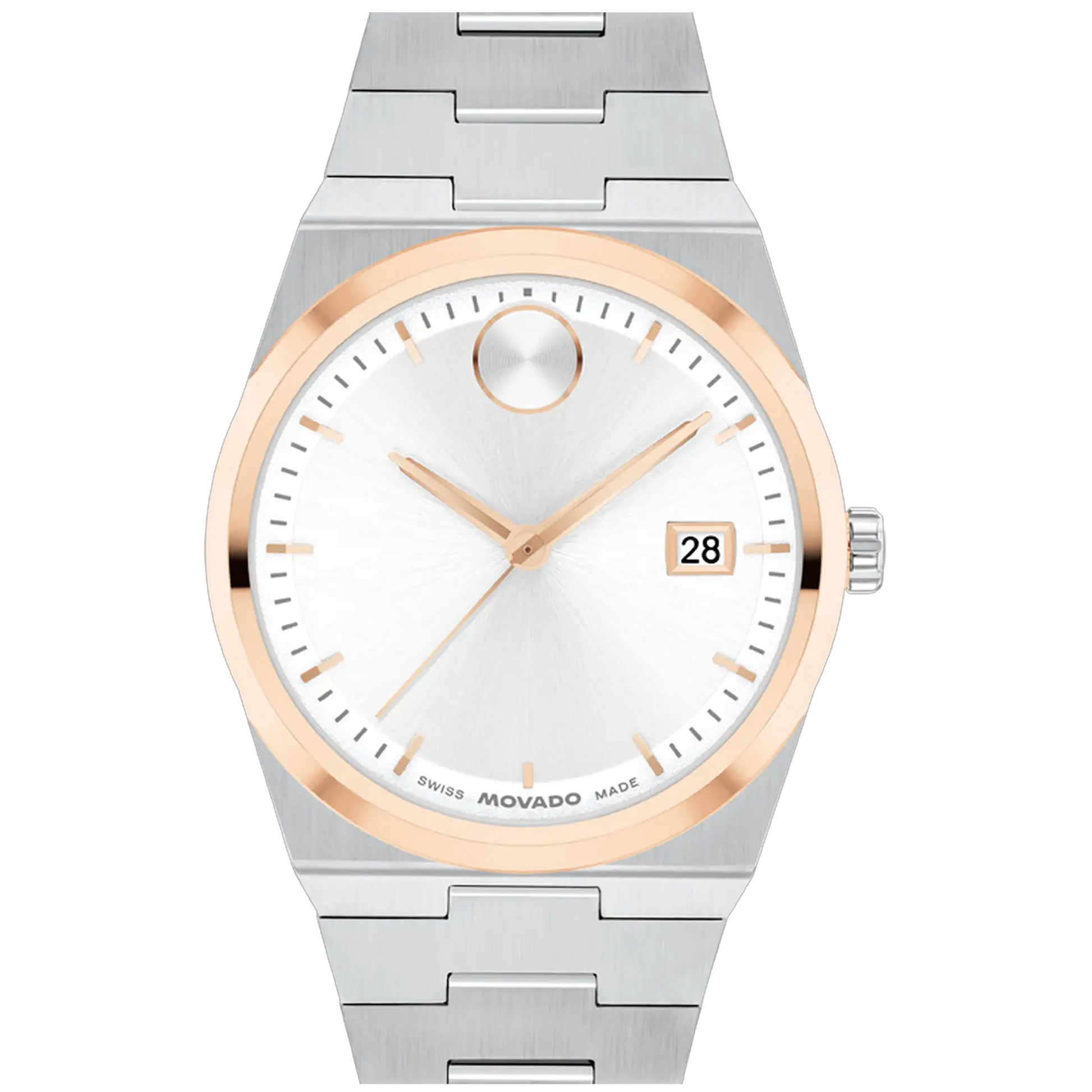 La BOLD Quest est tournée vers l'avenir avec un boîtier profilé et un bracelet intégré. Cette montre de 40 mm est dotée d'un cadran blanc, d'aiguilles couleur or rose et de notre point signature à 12 heures.