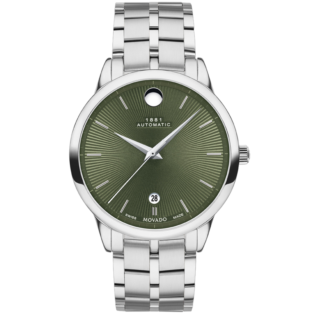 La montre automatique Movado 1881 est un chef-d'œuvre d'élégance et de précision. Dotée d'un boîtier en acier inoxydable de 39 mm et d'un cadran noir texturé captivant, cette montre respire la sophistication. Son allure est complétée par un bracelet en cuir de veau noir qui ajoute une touche de raffinement. Ce qui distingue cette montre, c'est son fond de boîtier, qui présente un mouvement automatique exposé, incarnant le mélange parfait d'art et de fonctionnalité.