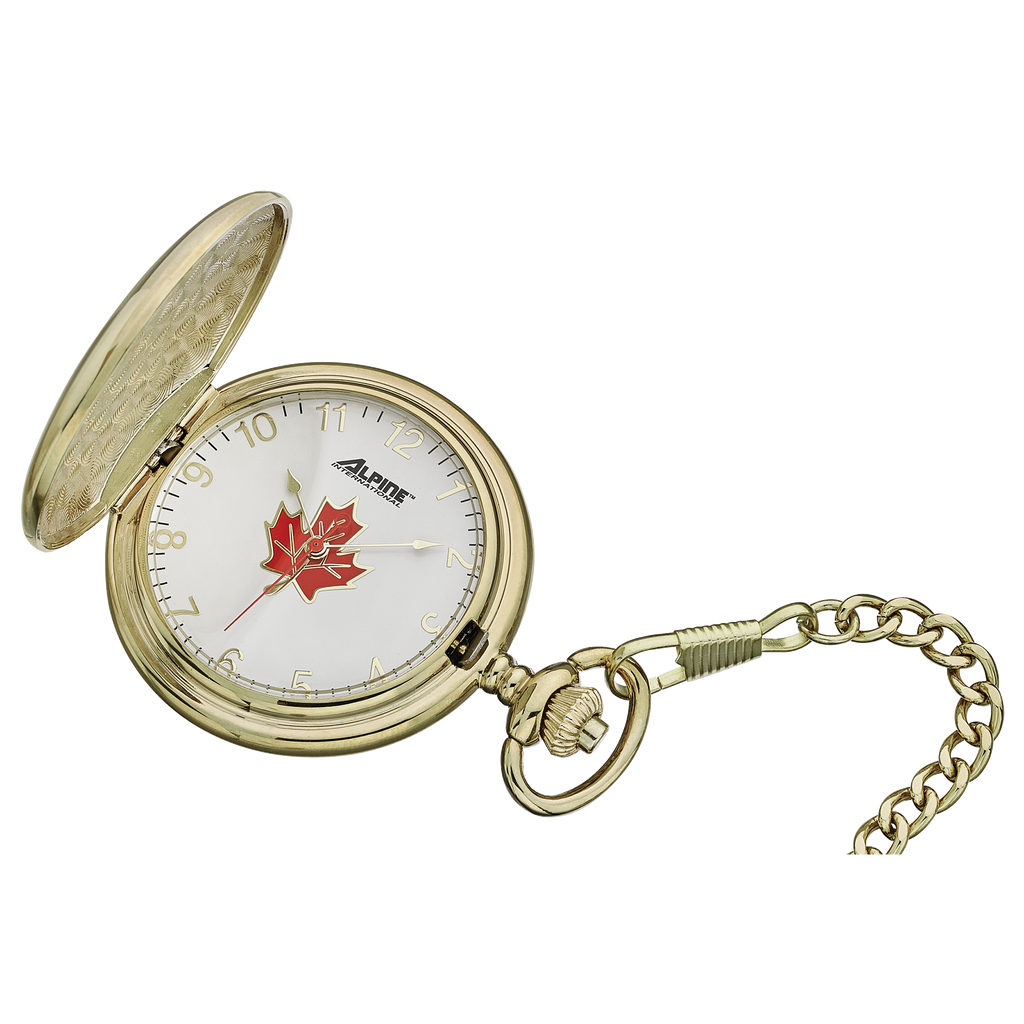 ਅਲਪਾਈਨ ਕੁਆਰਟਜ਼ ਪਾਕੇਟ ਵਾਚ - ਮੈਪਲ ਲੀਫ ਦੇ ਨਾਲ ਗੋਲਡ ਟੋਨ