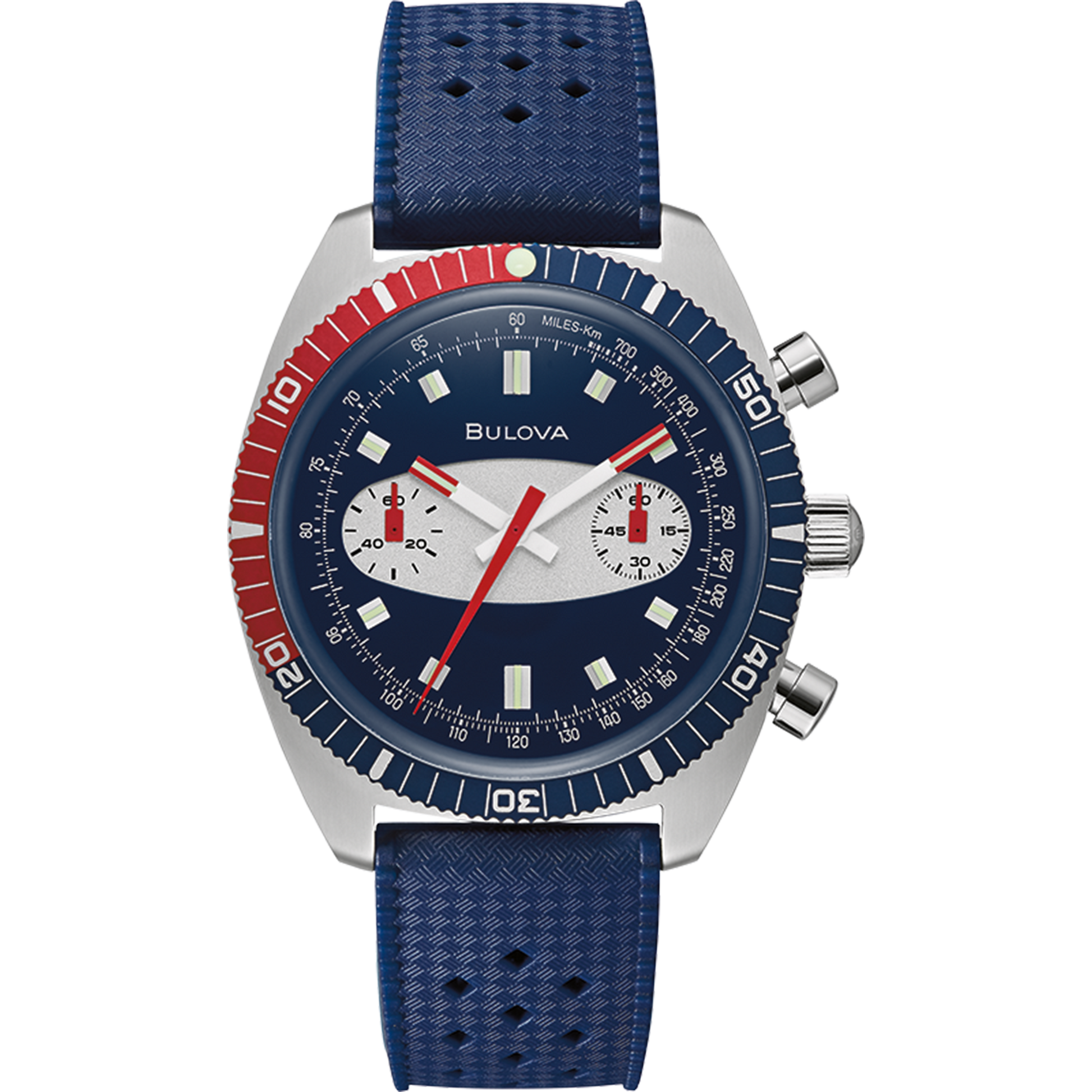 ਇਤਿਹਾਸ ਤੋਂ ਪ੍ਰੇਰਿਤ ਇੱਕ ਸ਼ੈਲੀ, ਕ੍ਰੋਨੋਗ੍ਰਾਫ ਏ 1970 ਦੇ ਦਹਾਕੇ ਦੇ ਬੁਲੋਵਾ ਦੇ ਡਾਈਵਰ ਕ੍ਰੋਨੋਗ੍ਰਾਫਾਂ ਦੀਆਂ ਪ੍ਰਸਿੱਧ ਸ਼ੈਲੀਆਂ ਦਾ ਇੱਕ ਸੰਕੇਤ ਹੈ। ਇਸ ਸ਼ੈਲੀ ਨੂੰ ਦੋ ਸਬ ਡਾਇਲਾਂ ਨੂੰ ਘੇਰਨ ਵਾਲੇ ਵਿਲੱਖਣ ਨੀਲੇ ਅੰਡਾਕਾਰ "ਸਰਫਬੋਰਡ" ਲਈ "ਸਰਫਬੋਰਡ" ਵਜੋਂ ਜਾਣਿਆ ਜਾਂਦਾ ਸੀ। ਇਸ ਅੱਪਡੇਟ ਕੀਤੇ ਸੰਸਕਰਣ ਵਿੱਚ ਨੀਲੇ ਅਤੇ ਲਾਲ ਲਹਿਜ਼ੇ ਦੇ ਨਾਲ ਇੱਕ ਸਟੇਨਲੈਸ ਸਟੀਲ ਕੇਸ ਅਤੇ ਇੱਕ ਨੀਲਾ ਡਾਇਲ ਹੈ। ਡਾਇਲ ਵਿੱਚ ਸਬ ਡਾਇਲਾਂ ਦੇ ਆਲੇ ਦੁਆਲੇ ਚਿੱਟੇ ਰੰਗ ਵਿੱਚ ਮਹੱਤਵਪੂਰਨ ਅੰਡਾਕਾਰ, ਨਾਲ ਹੀ ਲਾਲ ਟਿਪਡ ਘੰਟਾ ਅਤੇ ਮਿੰਟ ਹੱਥ, ਚਮਕਦਾਰ ਹੱਥ ਅਤੇ ਮਾਰਕਰ, ਅਤੇ ਇੱਕ ਲਾਲ ਕ੍ਰੋਨੋਗ੍ਰਾਫ ਦੂਜਾ ਹੱਥ ਹੈ। ਪੰਜ-ਹੱਥਾਂ ਵਾਲਾ ਕ੍ਰੋਨੋਗ੍ਰਾਫ ਕੁਆਰਟਜ਼ ਮੂਵਮੈਂਟ, ਐਂਟੀ-ਰਿਫਲੈਕਟਿਵ ਕੋਟਿੰਗ ਦੇ ਨਾਲ ਗੁੰਬਦਦਾਰ ਨੀਲਮ ਕ੍ਰਿਸਟਲ। ਡਿਪਲਾਇਐਂਟ ਕਲੋਜ਼ਰ ਦੇ ਨਾਲ ਨੀਲਾ ਪਰਫੋਰੇਟਿਡ ਸਿਲੀਕੋਨ ਸਟ੍ਰੈਪ। 200 ਮੀਟਰ ਤੱਕ ਪਾਣੀ ਪ੍ਰਤੀਰੋਧ।