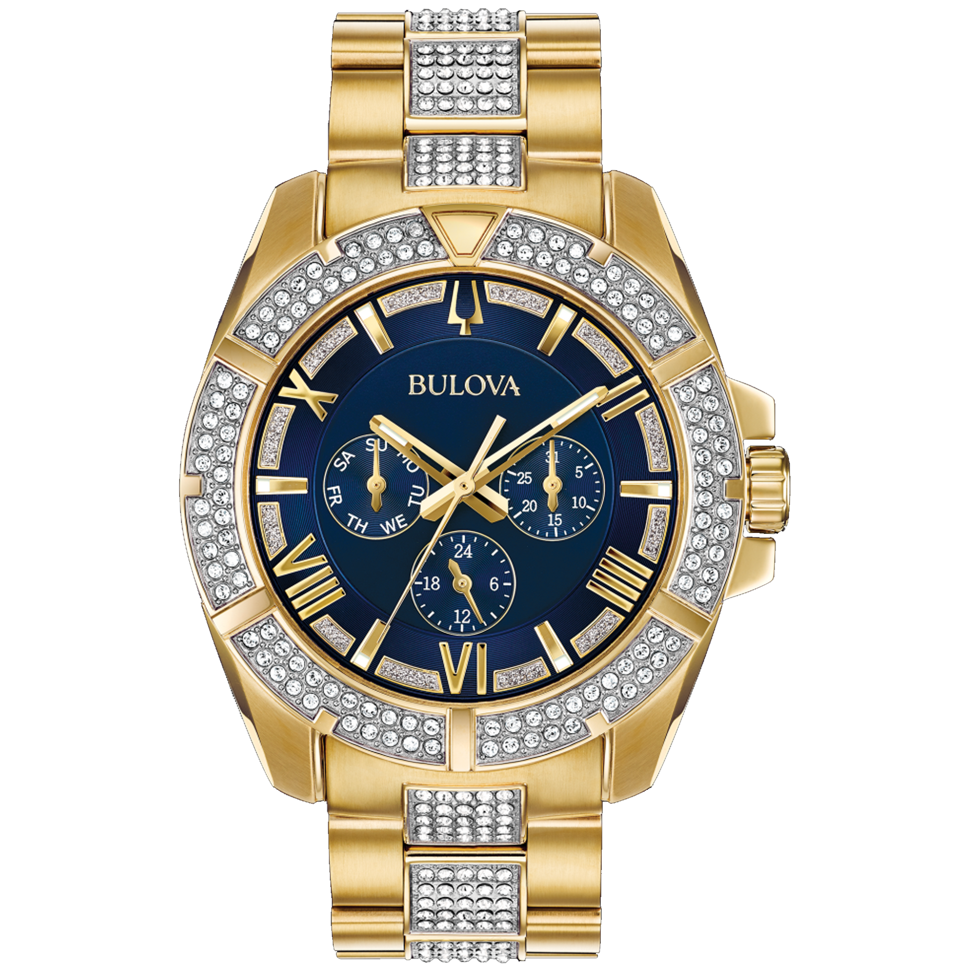 ਕ੍ਰਿਸਟਲ ਸੰਗ੍ਰਹਿ ਤੋਂ। ਸੋਨੇ ਦੇ ਰੰਗ ਦੇ ਸਟੇਨਲੈਸ ਸਟੀਲ ਵਿੱਚ। ਬੇਜ਼ਲ 'ਤੇ 318 ਸਵਰੋਵਸਕੀ® ਕ੍ਰਿਸਟਲ, ਨੀਲਾ ਡਾਇਲ ਅਤੇ ਬਰੇਸਲੇਟ, ਛੇ-ਹੱਥਾਂ ਵਾਲਾ ਮਲਟੀ-ਫੀਚਰ ਮੂਵਮੈਂਟ, ਚਮਕਦਾਰ ਹੱਥ ਅਤੇ ਮਾਰਕਰ, ਮਿਨਰਲ ਗਲਾਸ, ਡਿਪਲਾਇਐਂਟ ਕਲੋਜ਼ਰ ਵਾਲਾ ਸੋਨੇ ਦੇ ਟੋਨ ਵਾਲਾ ਸਟੇਨਲੈਸ ਬਰੇਸਲੇਟ, ਅਤੇ 30 ਮੀਟਰ ਤੱਕ ਪਾਣੀ ਪ੍ਰਤੀਰੋਧ ਨਾਲ ਸਜਾਇਆ ਗਿਆ।