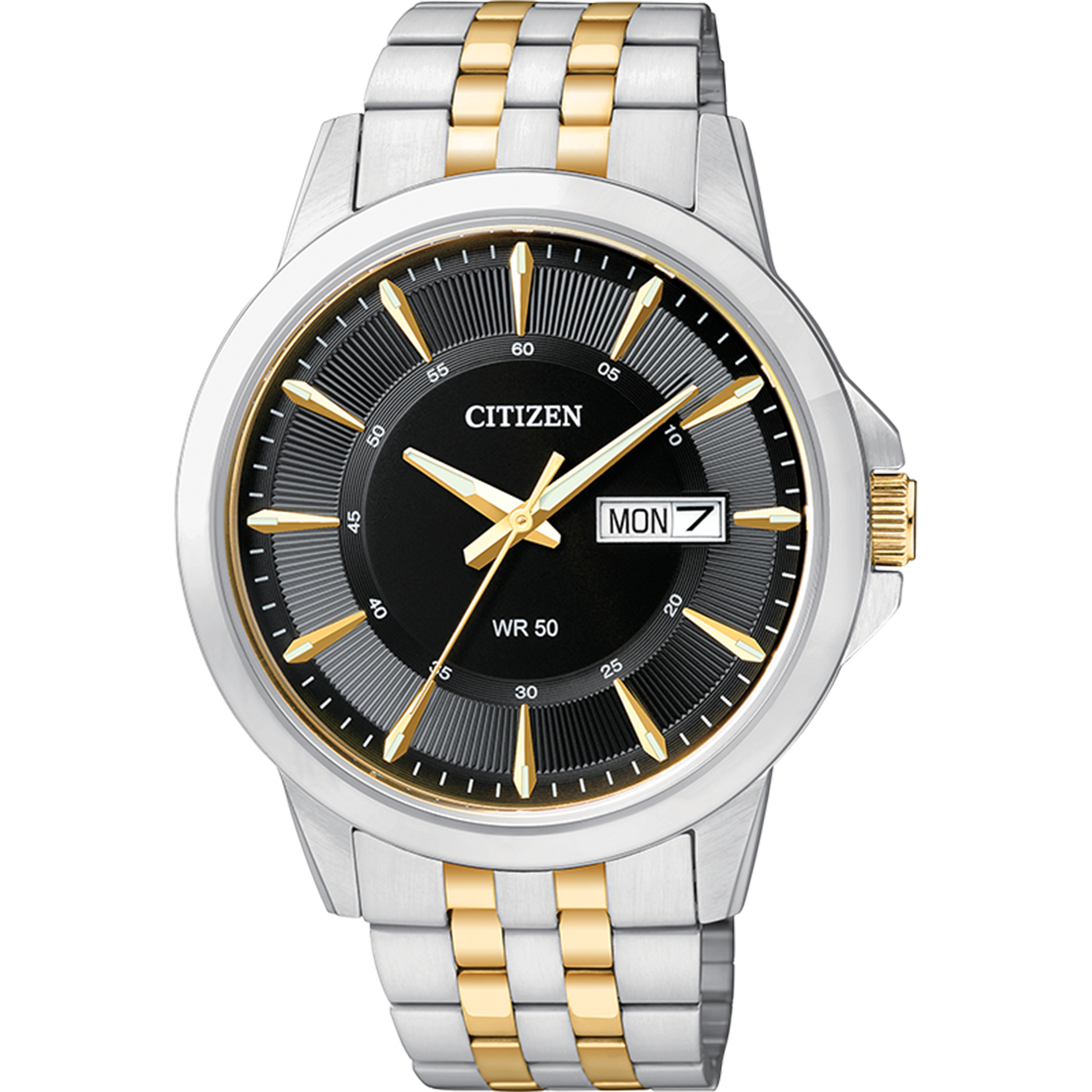 ਸਪੋਰਟੀ ਅਤੇ ਸੂਝਵਾਨ, ਇਹ ਪੁਰਸ਼ਾਂ ਦੀ ਸਿਟੀਜ਼ਨ ਕੁਆਰਟਜ਼ ਘੜੀ ਉਸਦੇ ਕਾਰੋਬਾਰੀ ਜਾਂ ਵੀਕਐਂਡ ਲੁੱਕ ਵਿੱਚ ਇੱਕ ਆਕਰਸ਼ਕ ਵਾਧਾ ਹੈ। ਦੋ-ਟੋਨ ਵਾਲੇ ਸਟੇਨਲੈਸ ਸਟੀਲ ਵਿੱਚ ਤਿਆਰ ਕੀਤਾ ਗਿਆ, ਇਹ ਸੁੰਦਰ ਡਿਜ਼ਾਈਨ ਸੋਨੇ ਦੇ ਟੋਨ ਐਕਸੈਂਟ ਅਤੇ ਮਾਰਕਰਾਂ ਦੇ ਨਾਲ ਇੱਕ ਕਾਲਾ ਡਾਇਲ, ਤਿੰਨ ਵਜੇ ਦੇ ਘੰਟੇ 'ਤੇ ਦਿਨ/ਤਾਰੀਖ ਡਿਸਪਲੇਅ, ਅਤੇ ਦੂਜੇ ਹੱਥ ਨਾਲ ਸਵੀਪ ਕਰਨ ਦਾ ਮਾਣ ਕਰਦਾ ਹੈ। ਸਟਾਈਲਿਸ਼ ਲਿੰਕ ਬਰੇਸਲੇਟ ਇੱਕ ਫੋਲਡ-ਓਵਰ ਕਲੈਪ ਨਾਲ ਸੁਰੱਖਿਅਤ ਹੁੰਦਾ ਹੈ। ਸਹੀ ਸਮਾਂ ਰੱਖਣ ਨੂੰ ਯਕੀਨੀ ਬਣਾਉਂਦੇ ਹੋਏ, ਜਾਪਾਨੀ ਕੁਆਰਟਜ਼ ਮੂਵਮੈਂਟ ਤੁਹਾਨੂੰ ਸਮੇਂ 'ਤੇ ਸਹੀ ਰੱਖਦਾ ਹੈ। 50 ਮੀਟਰ ਤੱਕ ਪਾਣੀ-ਰੋਧਕ।