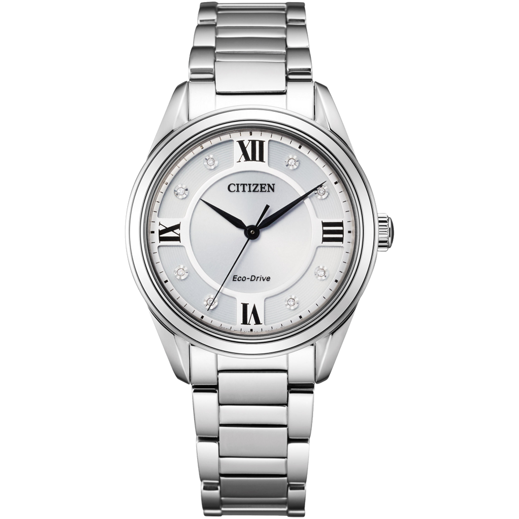 CITIZEN® ਦਾ Arezzo ਕਲਾਸਿਕ ਡਿਜ਼ਾਈਨ ਨੂੰ ਸੂਝਵਾਨ ਸੁੰਦਰਤਾ ਨਾਲ ਜੋੜਦਾ ਹੈ। ਇੱਕ ਸਟੇਨਲੈਸ ਸਟੀਲ ਦੇ ਕੇਸ ਅਤੇ ਬਰੇਸਲੇਟ ਵਿੱਚ ਥੋੜ੍ਹਾ ਜਿਹਾ ਵੱਡਾ ਕੇਸ ਅਤੇ ਇੱਕ ਨੀਲਮ ਕ੍ਰਿਸਟਲ ਦੇ ਨਾਲ ਦਿਖਾਇਆ ਗਿਆ ਹੈ। ਇਸ ਈਕੋ-ਡਰਾਈਵ ਦੁਆਰਾ ਸੰਚਾਲਿਤ ਘੜੀ ਵਿੱਚ ਕਾਲੇ ਰੋਮਨ ਅੰਕਾਂ ਅਤੇ 8 ਹੀਰਿਆਂ ਨਾਲ ਜੜਿਆ ਇੱਕ ਚਾਂਦੀ-ਟੋਨ ਡਾਇਲ ਹੈ।