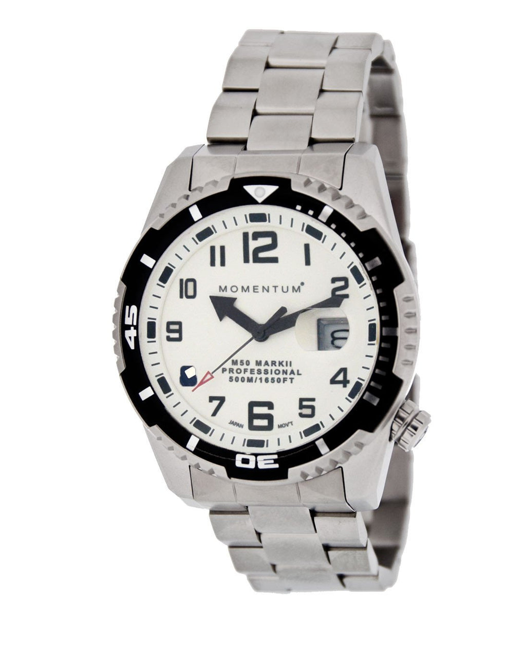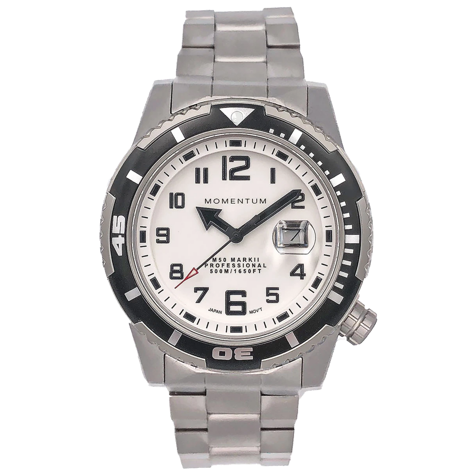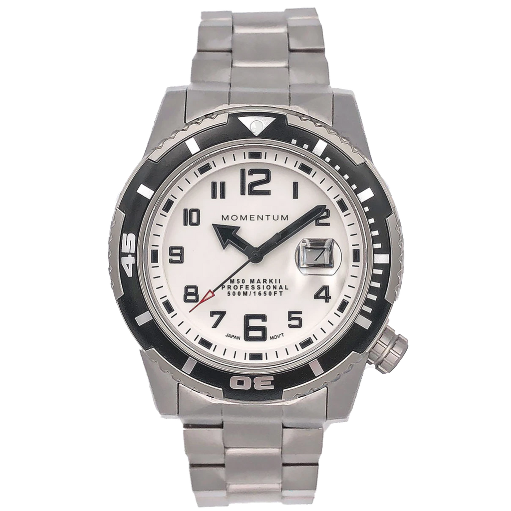 ਮੋਮੈਂਟਮ ਵਾਚ - M50 ਮਿਲਟਰੀ ਡਾਈਵ - ਸਟੀਲ ਬਰੇਸਲੇਟ 'ਤੇ ਚਿੱਟਾ ਡਾਇਲ