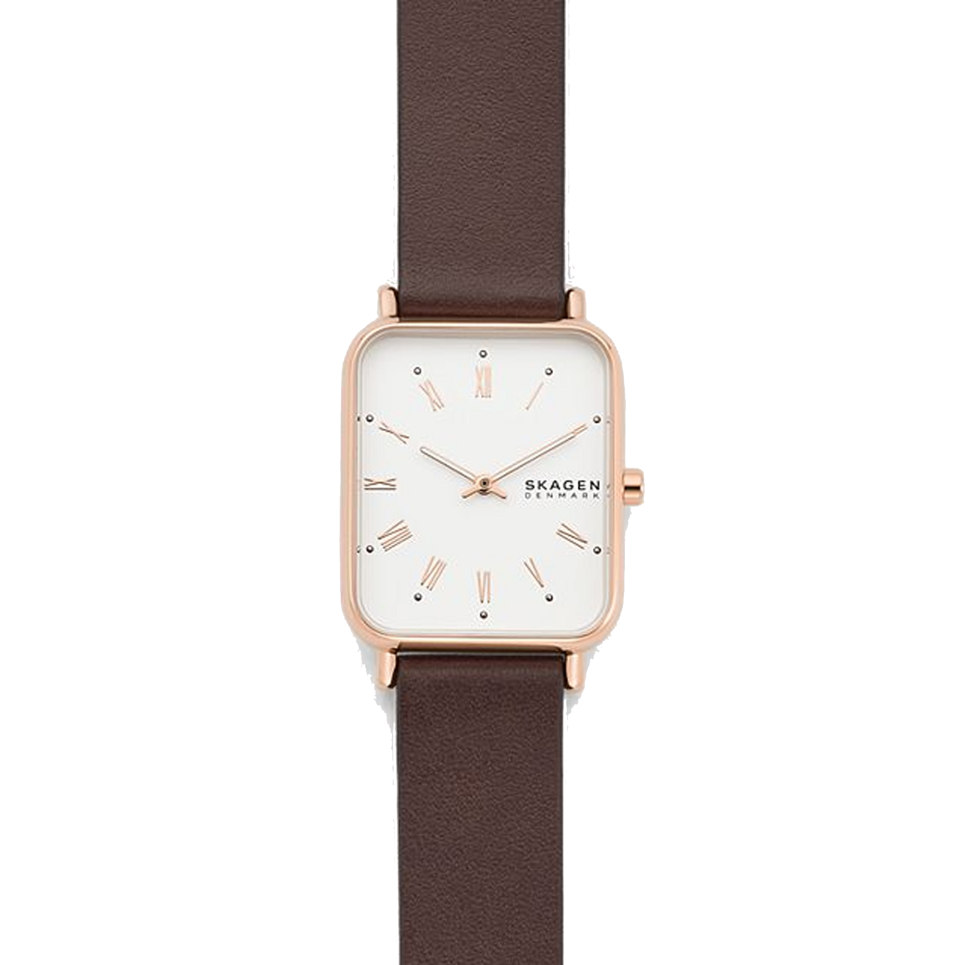 ਇਸ 28mm ਰਾਈਲ ਵਿੱਚ ਇੱਕ ਚਿੱਟਾ ਗਲੋਸੀ ਡਾਇਲ, ਦੋ-ਹੱਥਾਂ ਦੀ ਗਤੀ ਅਤੇ ਭੂਰੇ ਚਮੜੇ ਦਾ ਪੱਟਾ ਹੈ।