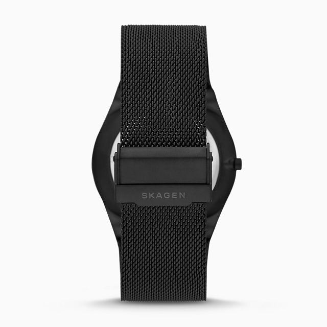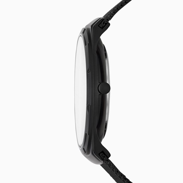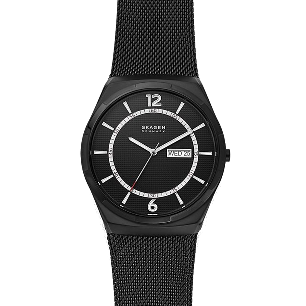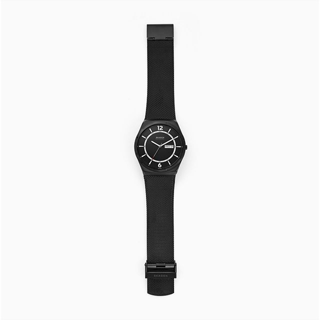 ਇਸ 45mm ਮੈਲਬੀ ਵਿੱਚ ਇੱਕ ਕਾਲਾ ਟੈਕਸਚਰਡ ਡਾਇਲ, ਤਿੰਨ-ਹੱਥਾਂ ਵਾਲਾ ਡੇ-ਡੇਟ ਮੂਵਮੈਂਟ ਅਤੇ ਕਾਲਾ ਸਟੀਲ-ਮੈਸ਼ ਸਟ੍ਰੈਪ ਹੈ।