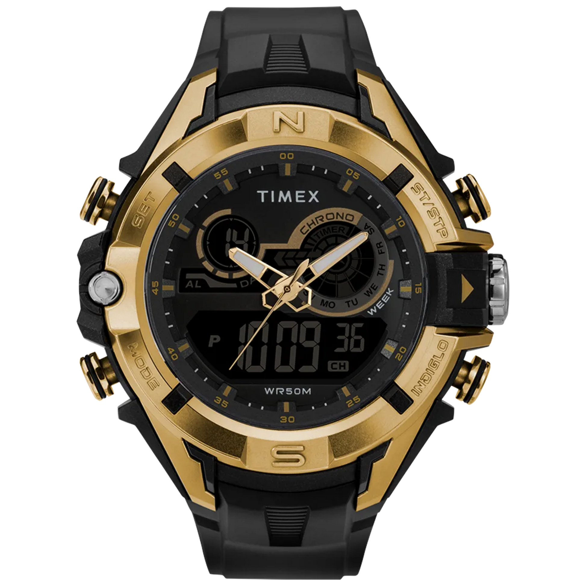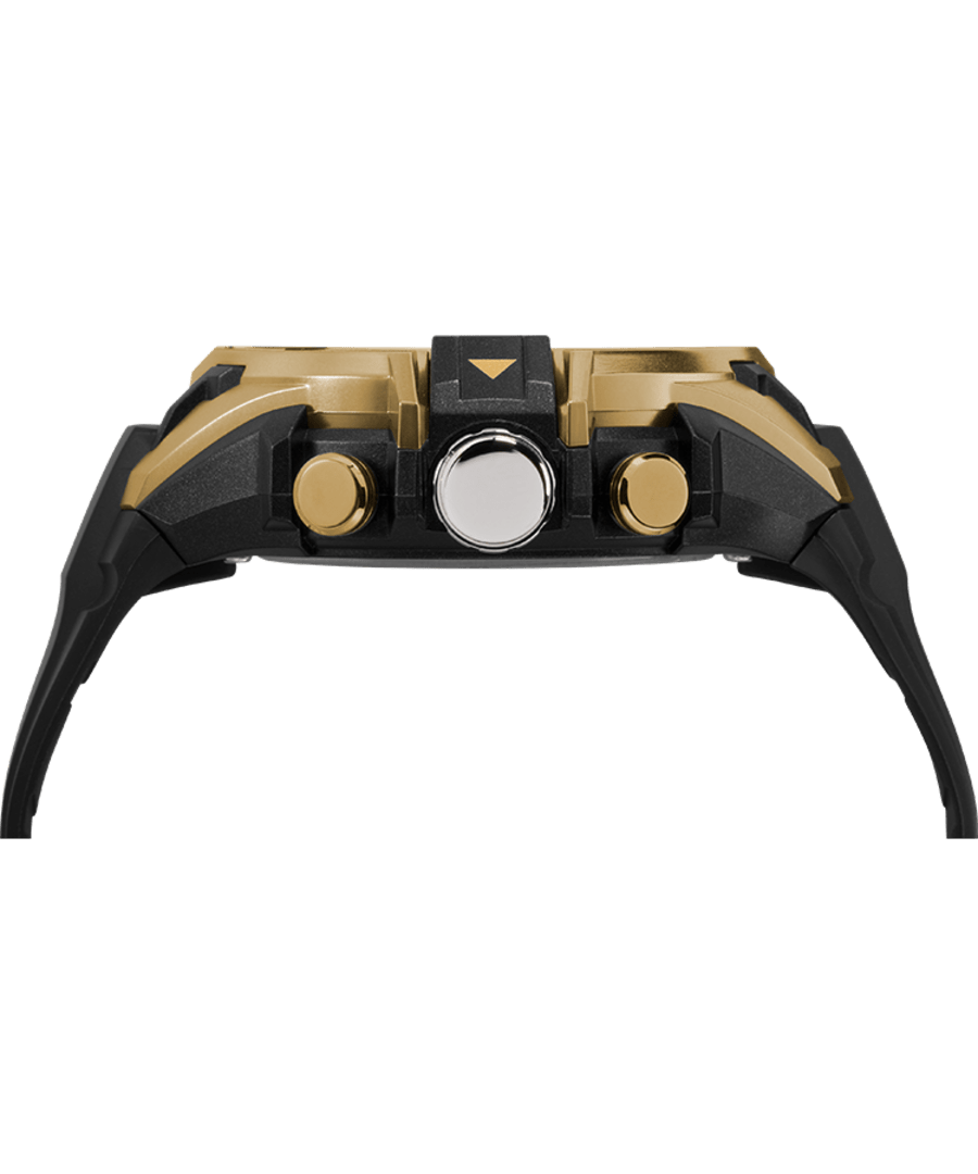 ਧਾਤੂ ਲਹਿਜ਼ੇ ਵਾਲਾ ਇੱਕ ਵਿਲੱਖਣ ਐਨਾਲਾਗ-ਡਿਜੀਟਲ ਘੜੀ ਰੂਪ ਅਤੇ ਕਾਰਜ ਦਾ ਸੁਮੇਲ ਬਣਾਉਂਦੀ ਹੈ। ਸੋਨੇ ਦੇ ਟੋਨ ਵਾਲੇ ਬੇਜ਼ਲ ਵਾਲਾ ਕਾਲਾ 50mm ਕੇਸ ਕ੍ਰੋਨੋਗ੍ਰਾਫ, ਅਲਾਰਮ, ਟਾਈਮਰ ਅਤੇ 50 ਮੀਟਰ ਤੱਕ ਪਾਣੀ ਪ੍ਰਤੀਰੋਧ ਦੇ ਨਾਲ ਇੰਡੀਗਲੋ® ਲਾਈਟ-ਅੱਪ ਵਾਚ ਡਾਇਲ ਦੀ ਪੇਸ਼ਕਸ਼ ਕਰਦਾ ਹੈ।