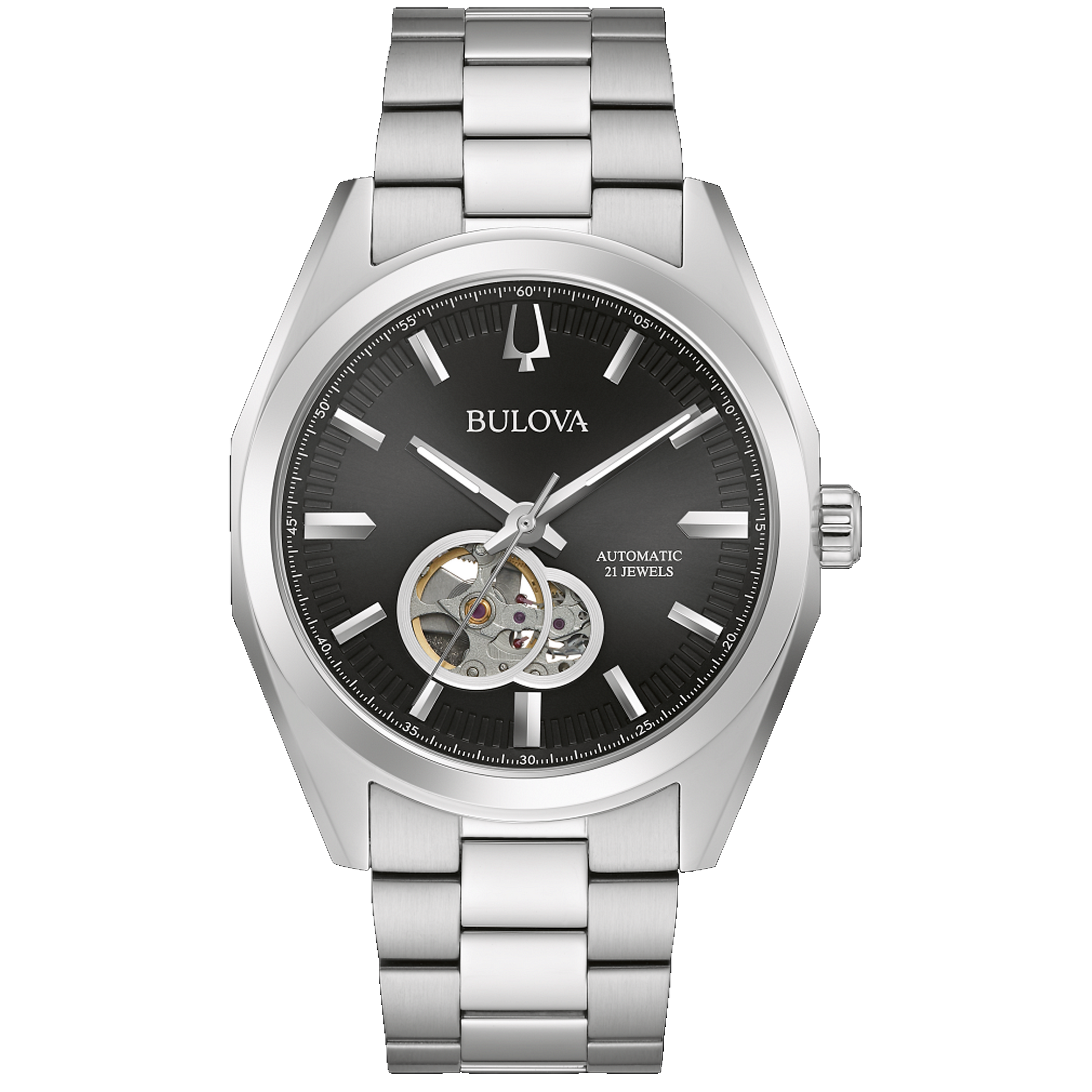 Part of the Surveyor line of Bulova watches, this updated classic automatic watch offers all of the detail and quality you would expect in a luxury watch, while staying at an affordable price point. The stainless steel case and bracelet is paired with a rich black dial with silver accents and an open aperture to view the movements balance wheel and escapement. The screw-back case is topped with a mineral crystal exhibition window to showcase the automatic movement powering the timepiece. This beautifully detailed, quality timepiece is destined to become a new favourite in any collection.