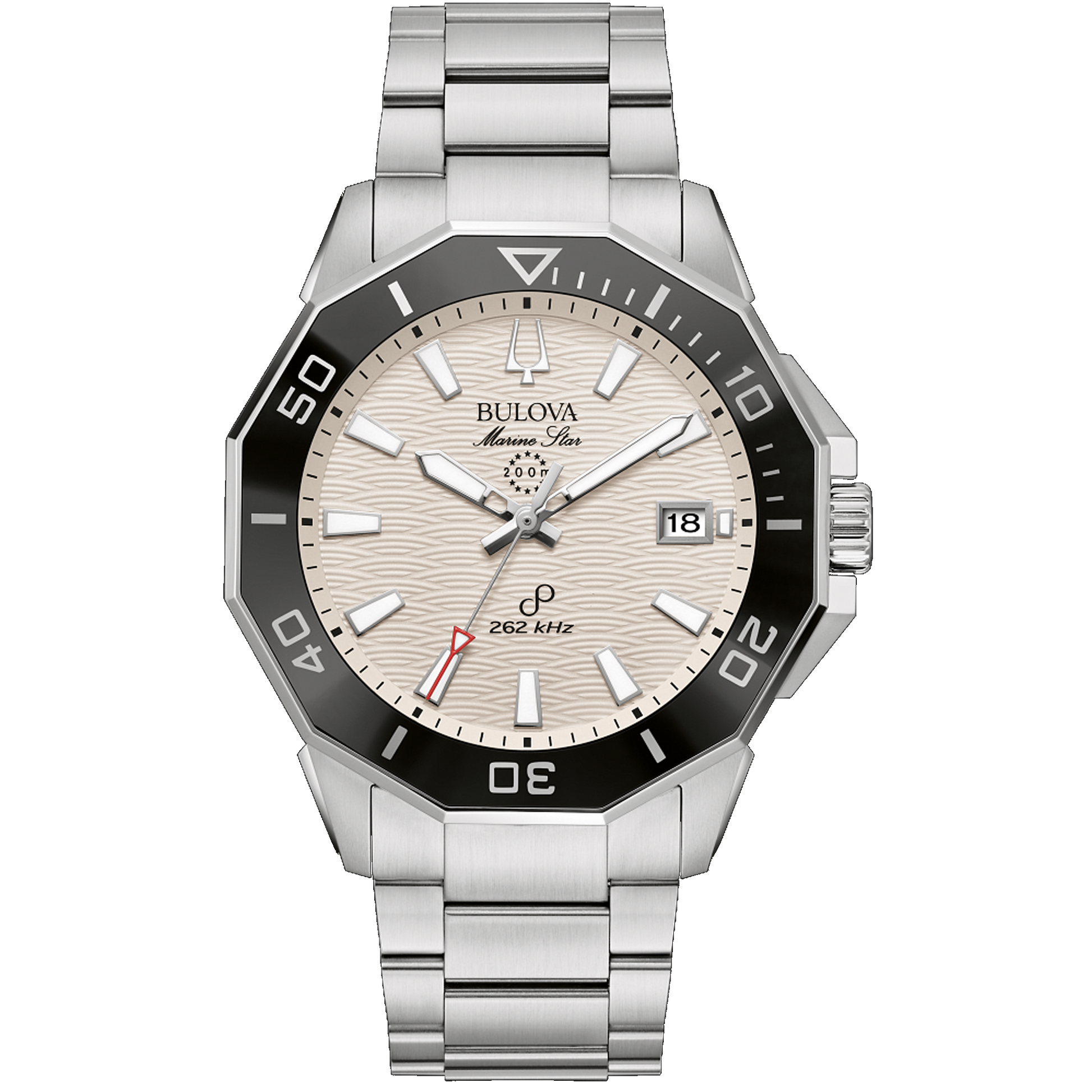 An incredibly bold design, this men's Bulova Marine Star Precisionist sport watch pushes the limits with Bulova's cutting edge technology and a strikingly modern case. Defined by a rugged, angular profile, the 43mm stainless steel case features brushed facets and polished accents, with a unidirectional timing bezel with a ceramic insert, a sapphire crystal, and a screw-down crown ensuring 200m water resistance. The bright white dial takes its inspiration from the undulating crests of the ocean, with a wave pattern accented by applied hour markers and a bold handset, all featuring luminescent material for unrivaled legibility in all conditions.