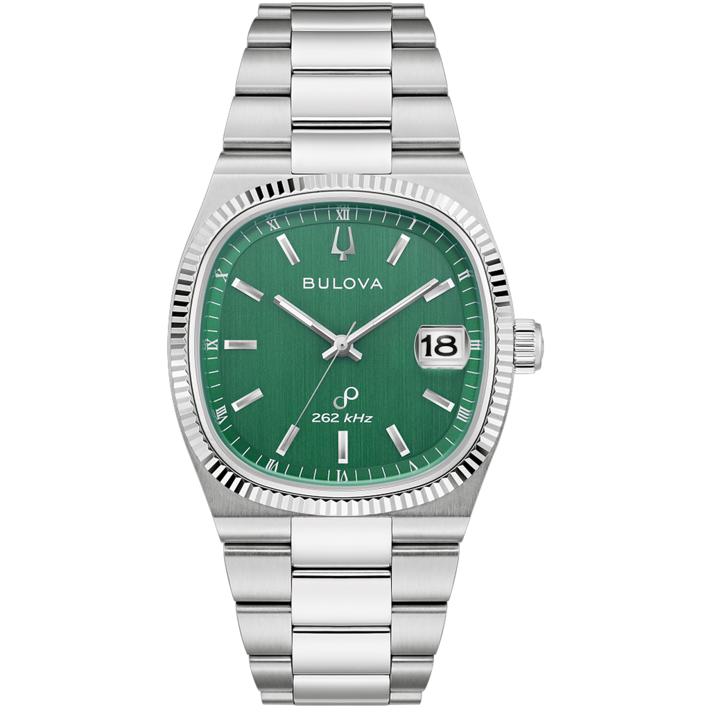 The compelling dial is a verdant vertical brushed green, with polished hands and indices and a date situated perfectly at 3 o’clock. The new Bulova Super Seville is powered by their proprietary high precision quartz Precisionist movement, a revolutionary 8-jewel quartz mechanism vibrating at a remarkable 262kHz, accurate to seconds per year with increased resistance to temperature changes, and with a sweeping seconds hand. Embrace an effortless kind of elegance with the men’s Bulova Super Seville.