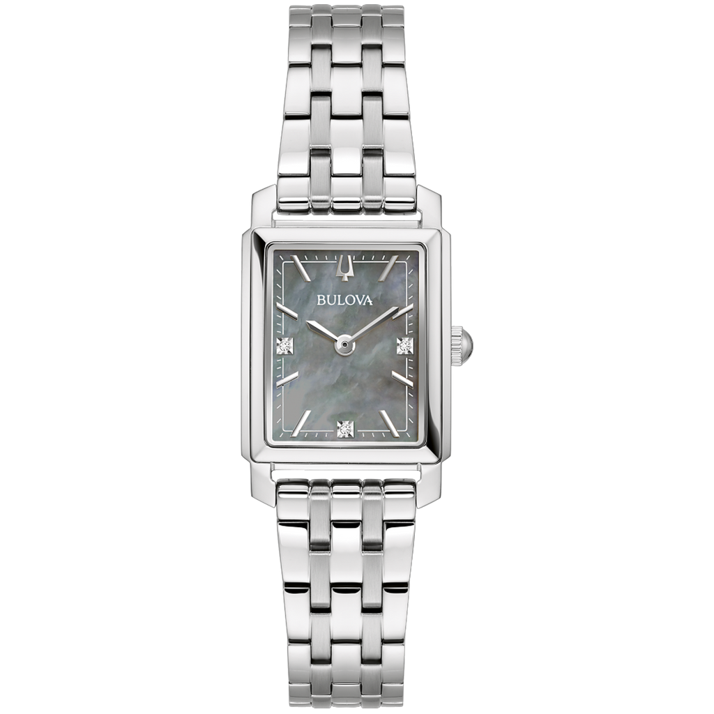 This petite Bulova women’s timepiece adds new style to the already impressive Sutton Collection. The refined silver-tone stainless steel rectangular case features a mineral crystal and finishing that shines brilliantly in the light. The lustrous grey mother-of-pearl dial features diamond accents and silver-tone hands and markers for a look of true elegance. A matching five-link silver-tone stainless steel bracelet features a deployant closure with pushers for a perfect fit and latched spring bars for easy release. A versatile Bulova ladies’ timepiece perfectly styled for a woman who is looking to add an elegant finishing touch to her ensemble.