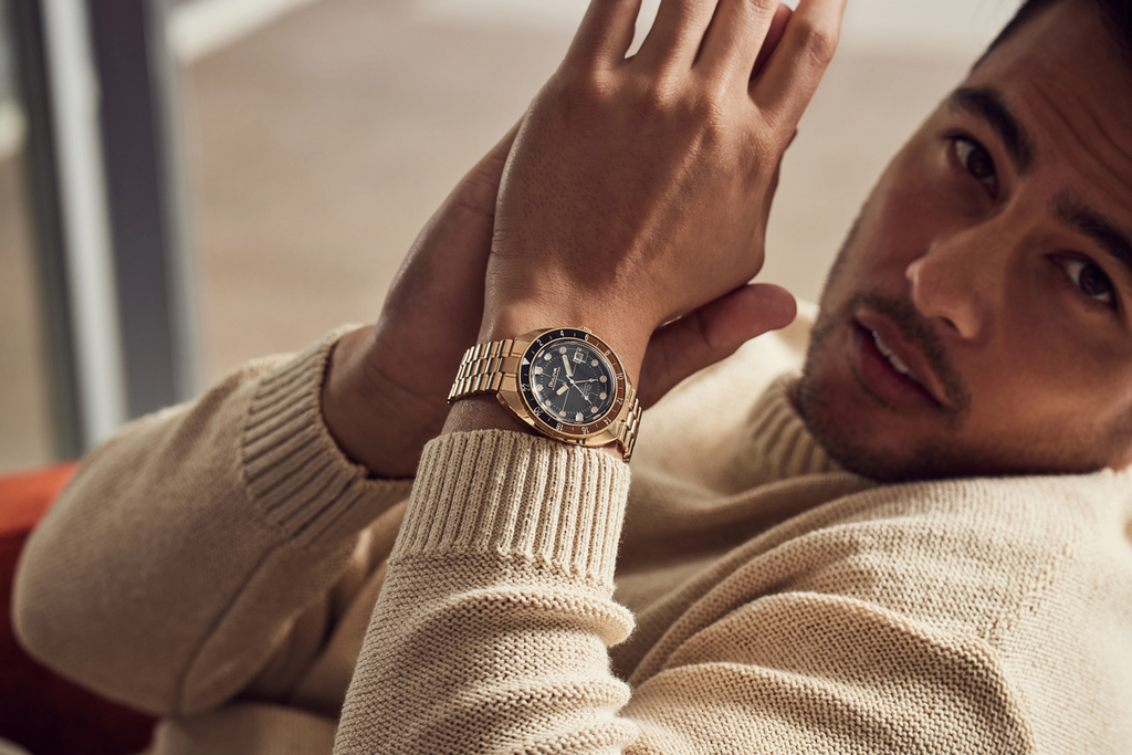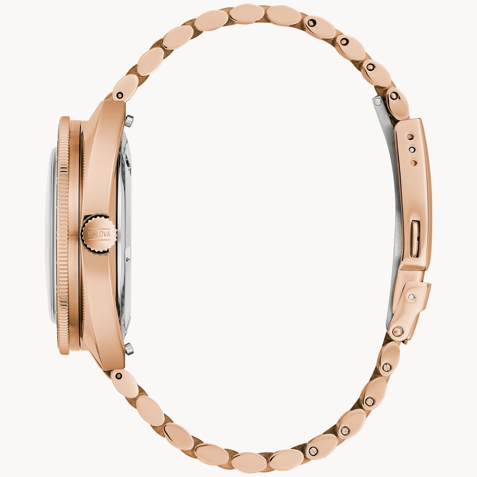 This new men’s Bulova Oceanographer GMT brings a new look and new functionality to the legendary Bulova design. The rose gold-tone stainless-steel case features a curved silhouette, a box sapphire crystal, a two-tone “root beer” bidirectional rotating 24-hour bezel, and a screw-down crown providing 200m of water resistance. A vivid black dial is accented by tasteful pops of rose gold colour, with applied luminescent hour markers, bold hands including a 24-hour hand and featuring luminescent paint, and a date display. An independently adjusted hour hand allows for easy setting of the local time.