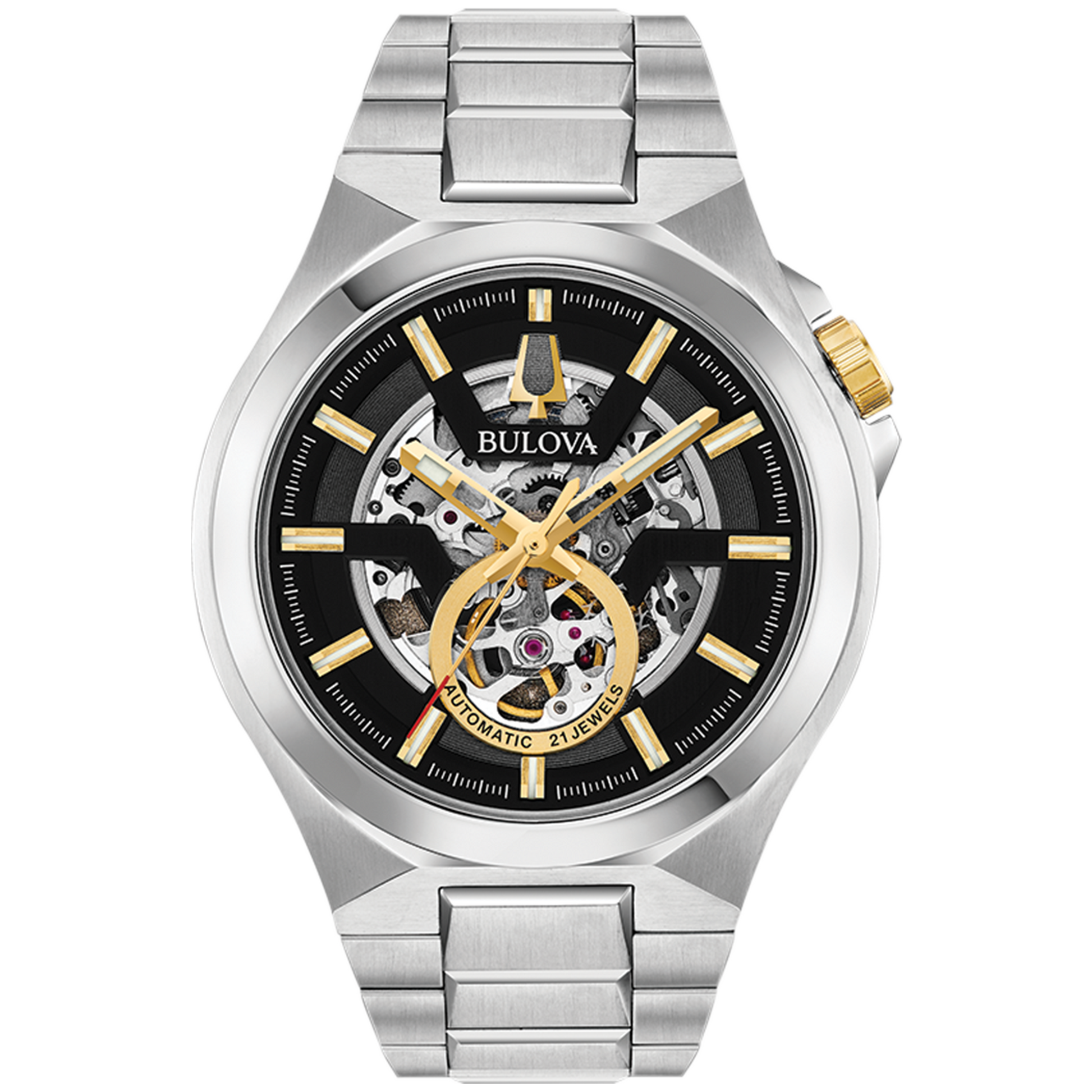 Maquina New sport style in silver-tone stainless steel case with a gold-tone crown. Open aperture black dial with gold-tone accents and luminous hands and markers. Automatic movement, sapphire glass, and silver-tone bracelet. Water resistance to 100 metres. diametre: 46mm Thickness: 12.6mm