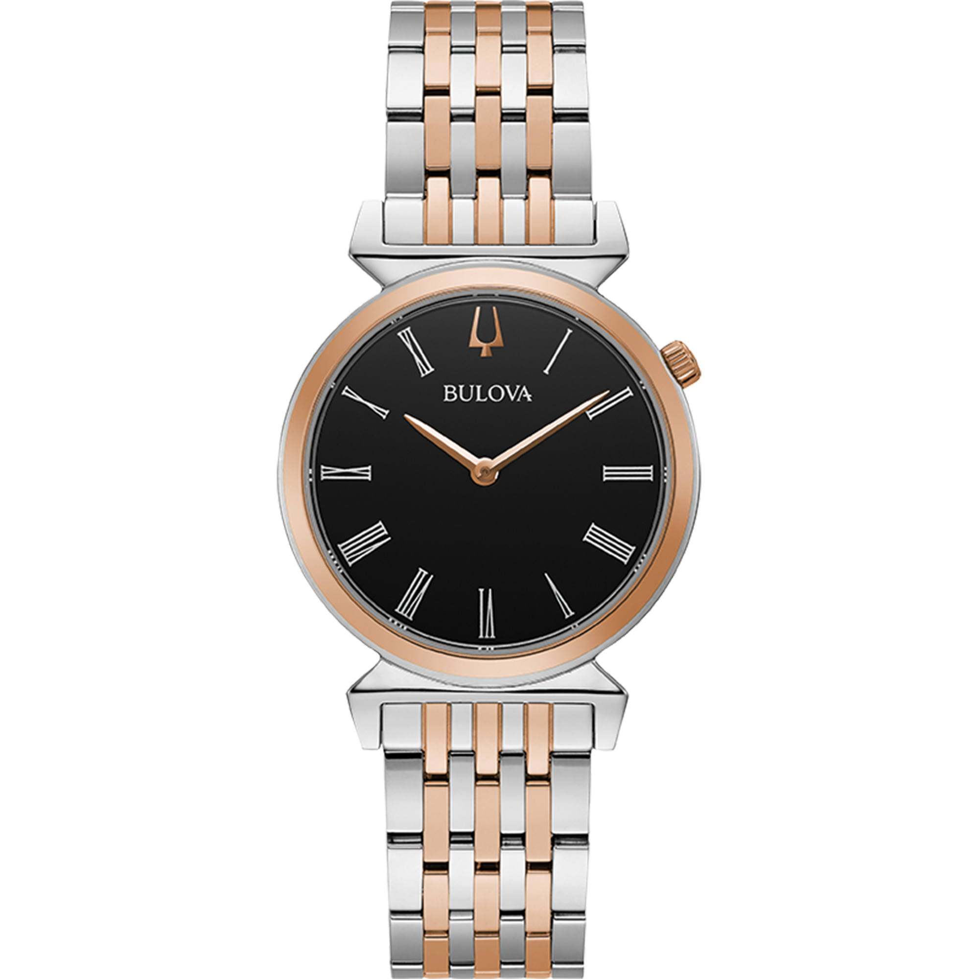 Inspired by Bulova heritage timepieces, the two-tone rose gold-tone stainless steel Regatta features slim Roman numeral markers on a black dial, the crown at the 2 o'clock position, and unique angled lugs and. Flat sapphire crystal, slim quartz movement, and water resistance to 30 meters.