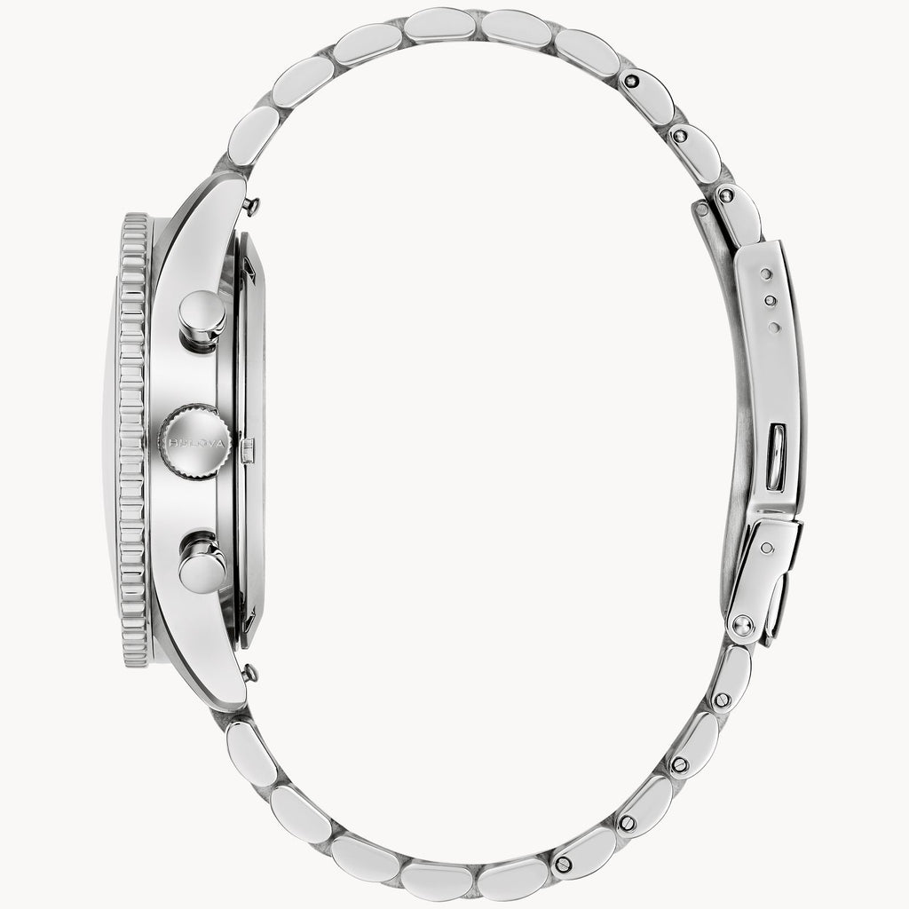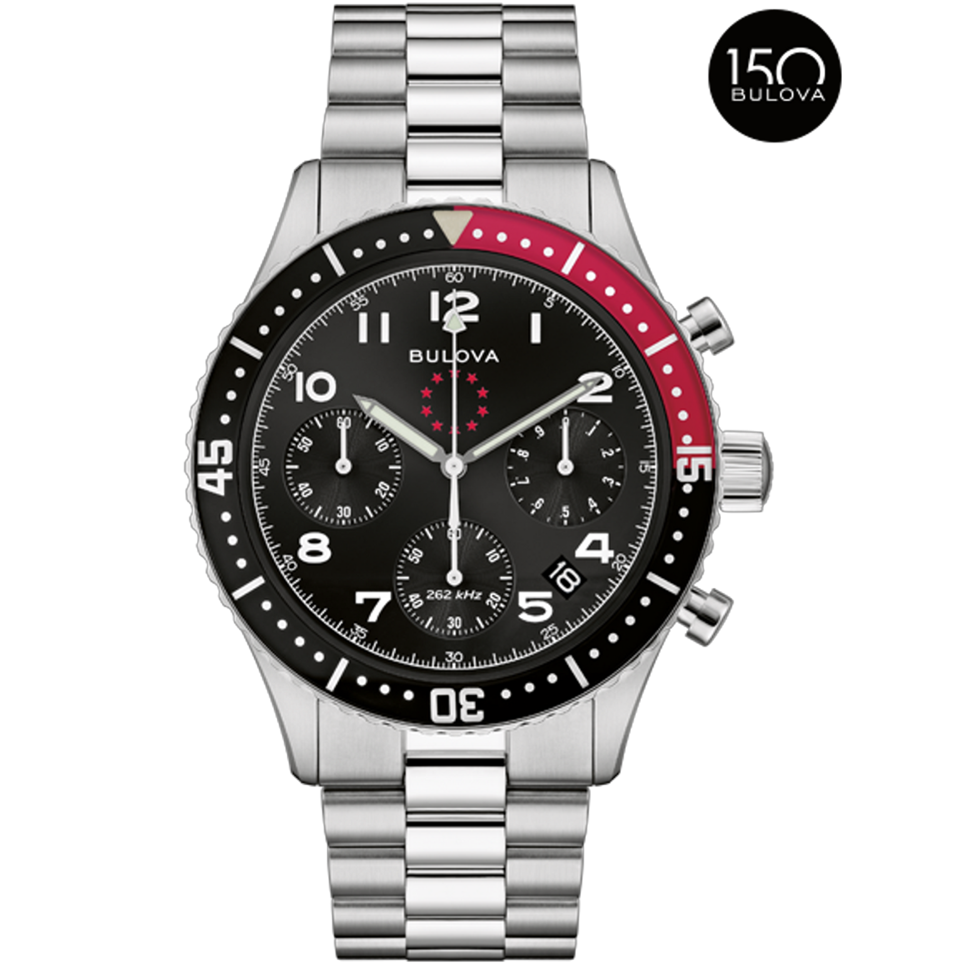 Inspired by the coveted Bulova’s Marine Star circa 1970s, this Special Edition Marine Star 6-hand chronograph celebrates one of Bulova’s most iconic collections for its 150th Anniversary. The silver-tone stainless steel case has a design that balances form and function with a striking ratcheting timing bezel, a commemorative case back featuring an original anchor design, and a profile-cut link bracelet with a push-button foldover closure.
