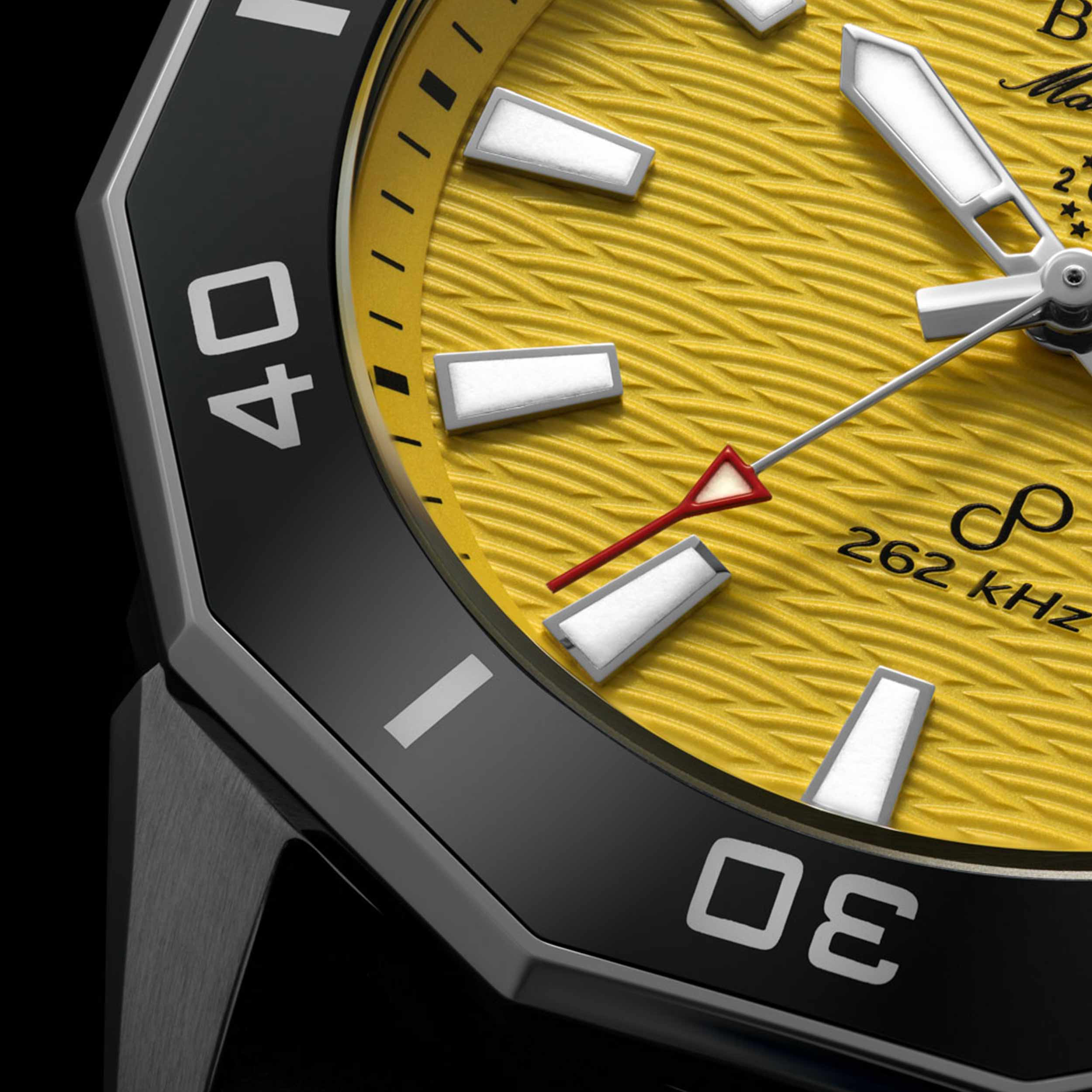The black dial showcases the vintage Marine Star logo, silver-tone hands, and white numerals with super luminous fill, a date display, and sub-dials, including registers allowing timing to 1/20 of a second and finished with a double domed sapphire crystal. This collector’s watch is powered by our proprietary Precisionist movement, resonating at a frequency of 262khz for unparalleled accuracy, and boasts 200m water resistance with a screw-down crown.