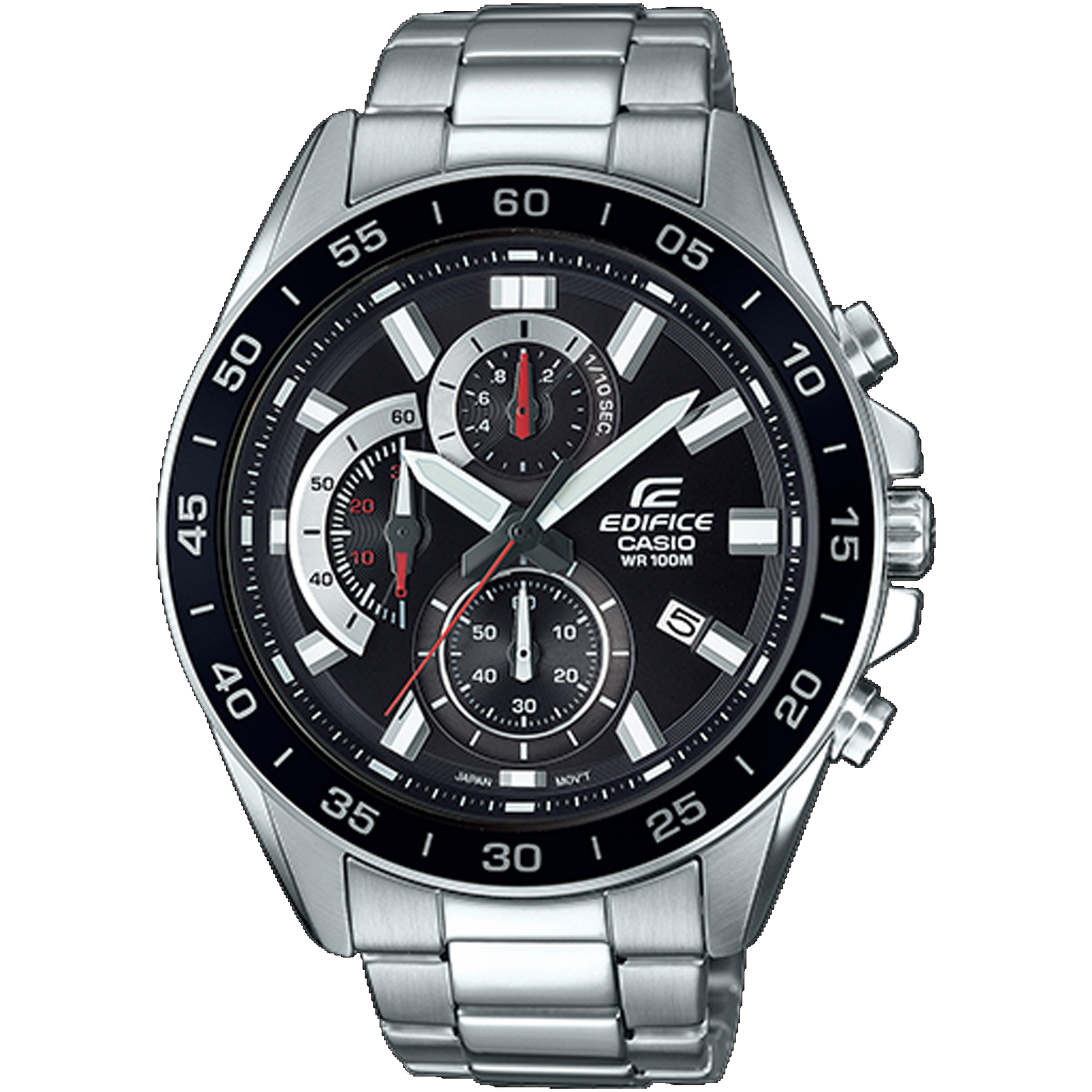 EDIFICE retrograde chronograph analog watch with 100 meter water resistance. Stopwatch function also included among the model features. Stainless steel band.