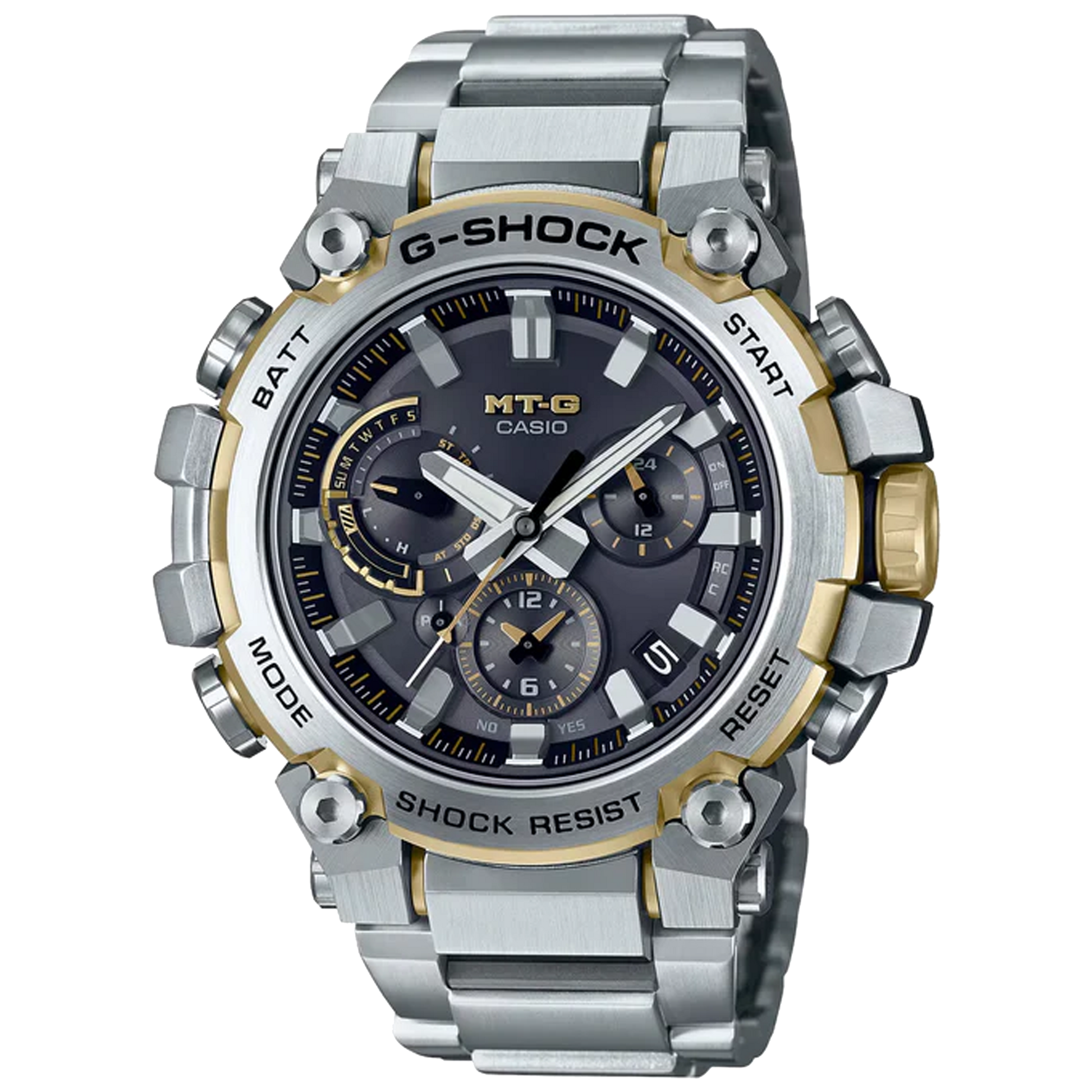 MT-G innovation extends even to the band. All-new one-touch exchange structure eliminates the need for special tools. Simply press the buttons located on the sides of the lugs to quickly and easily swap out the band.