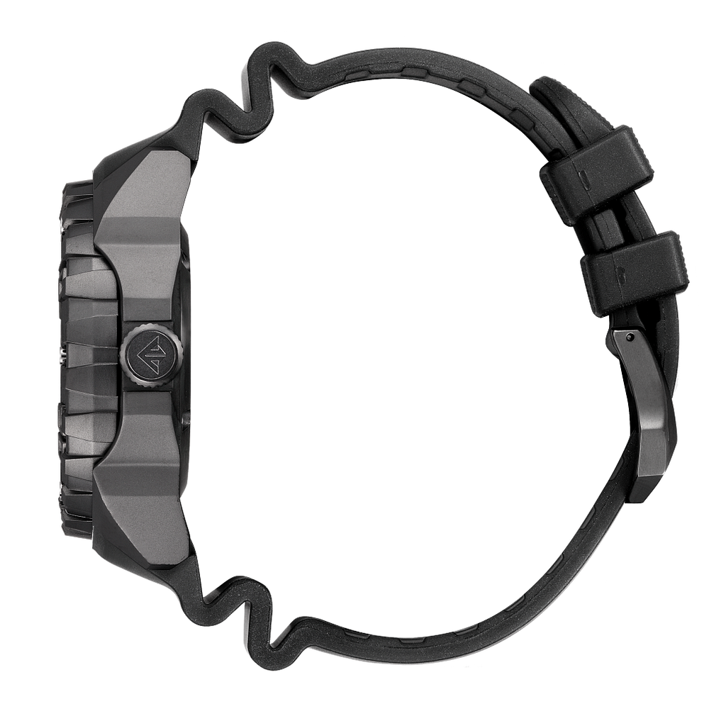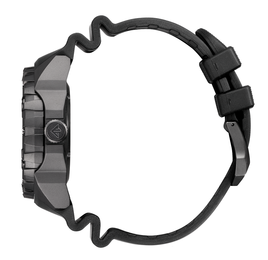 It can run for 42 hours when fully wound, with daily accuracy of -10 to +20 seconds – solid performance for a mechanical watch. The hour hand, minute hand, and indexes have a luminescent coating to ensure high visibility. The bold trapezoid indentations around the edge of the case are both stylish and functional, providing a rugged look and a sure grip when using the bezel. The case has a two-piece structure and uses Super Titanium™ with CITIZEN’s proprietary surface-hardening technology, Duratect, making the watch incredibly light for its size. The rugged and tough good looks of this model are enhanced by an intricate almost stud-like pyramid pattern on the bezel and the dial with shades that shift depending on the viewing angle.