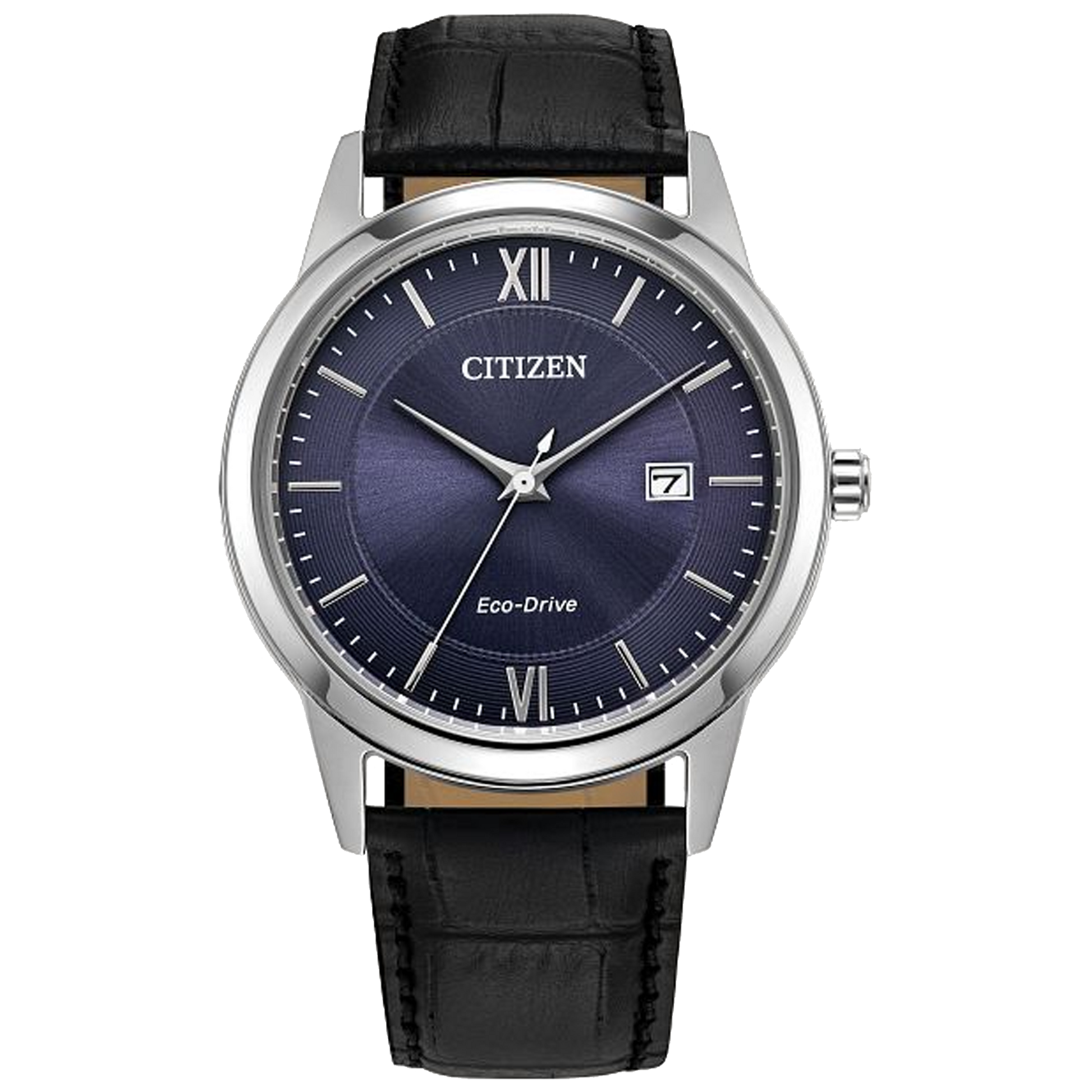 Classic lines and a simple silhouette define the newest addition to the Classic collection. This vintage-inspired timepiece features a silver-tone stainless steel case, a striking blue 3-hand dial with a date function, and a rich black leather strap with buckle closure. Sustainably powered by any light with Eco-Drive technology and never needs a battery.