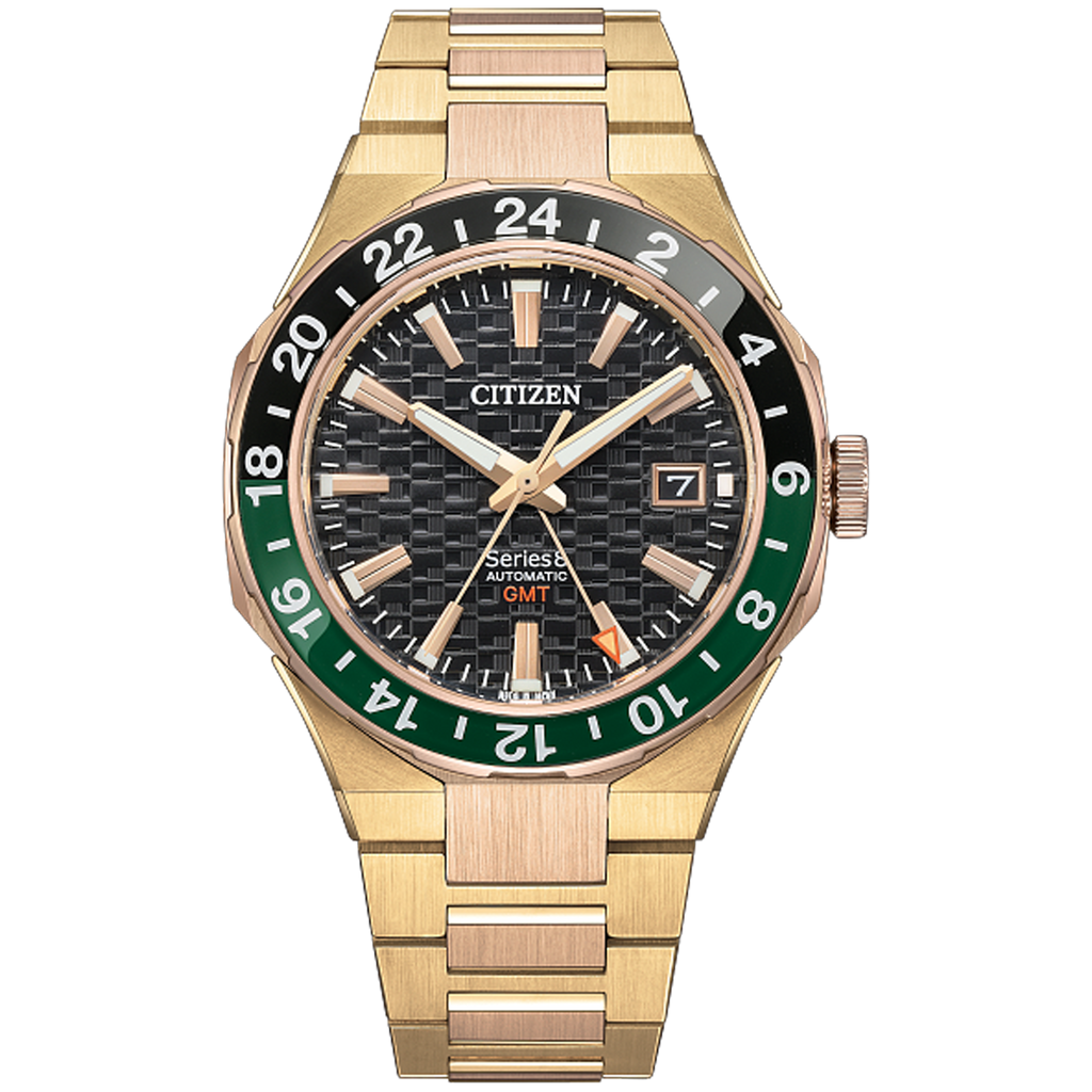 Functional and practical, modern and sporty –– the new Citizen Series 8 880 GMT is the perfect companion for daily wear to spirited travel and everything in between. Featuring a two-tone rose- and gold-tone stainless steel 41mm case with a black and green-tone bi-directional bezel, this timepiece highlights the best of Citizen's brushed and polished finishing techniques.