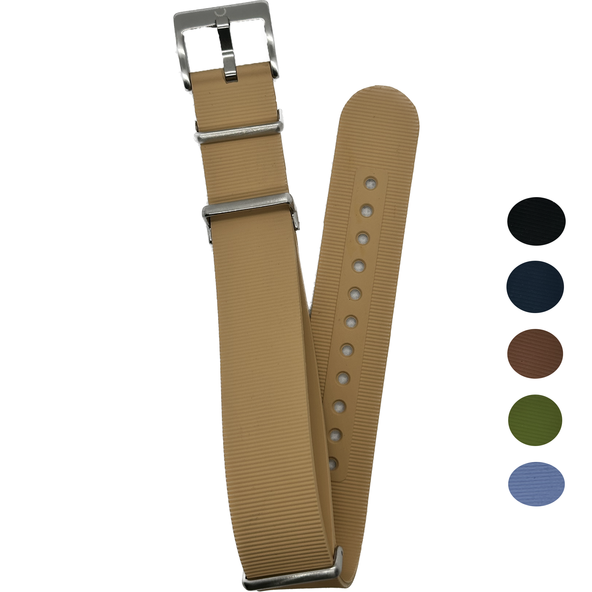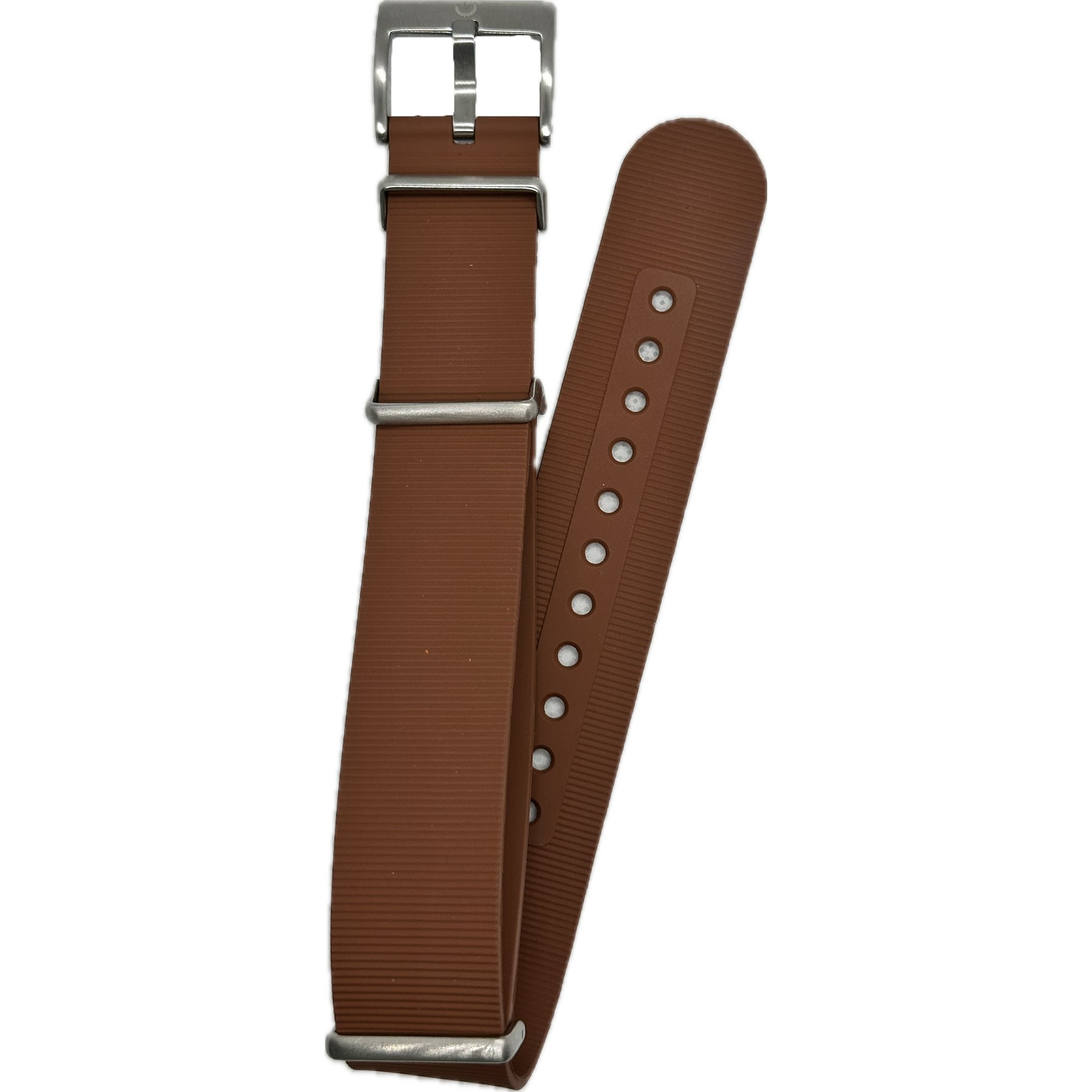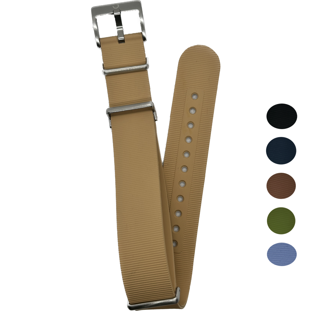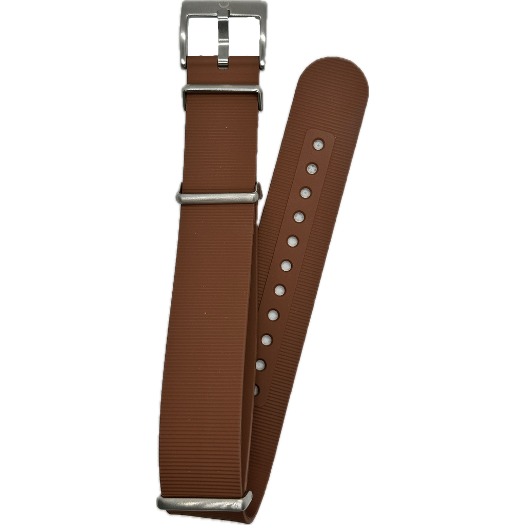 Introducing the FKM Rubber NATO Watch Band - a versatile and durable accessory for any timepiece enthusiast. Crafted from high-grade fluoroelastomer rubber, this strap is designed for comfort and longevity. Its vibrant color options add a pop of personality to your wristwear. Unique to this design is the convertibility feature; with a simple removal of the stainless steel hardware, the band transforms from a classic NATO style to a sleek single-pass strap, offering two distinct looks for varying preferences or occasions. The easy-to-adjust holes and sturdy buckle ensure a secure fit for all-day wear. Whether you're dressing up for an event or gearing up for an outdoor adventure, this watch band is engineered to complement both your watch and your lifestyle.