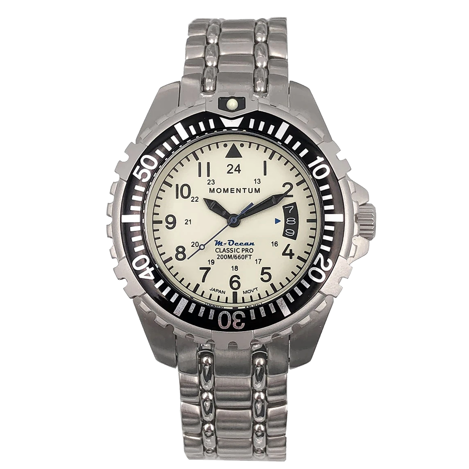 The new M-Ocean. For men who prefer an understated watch, in a more traditional, mid-size. Big performance for a smaller wrist, with a 200M rated, solid steel case and ultra-reliable, screw-down crown. The luminous dial/hands make it easy to read, day or night. The long-life batter delivers up to 5 years between battery changes.