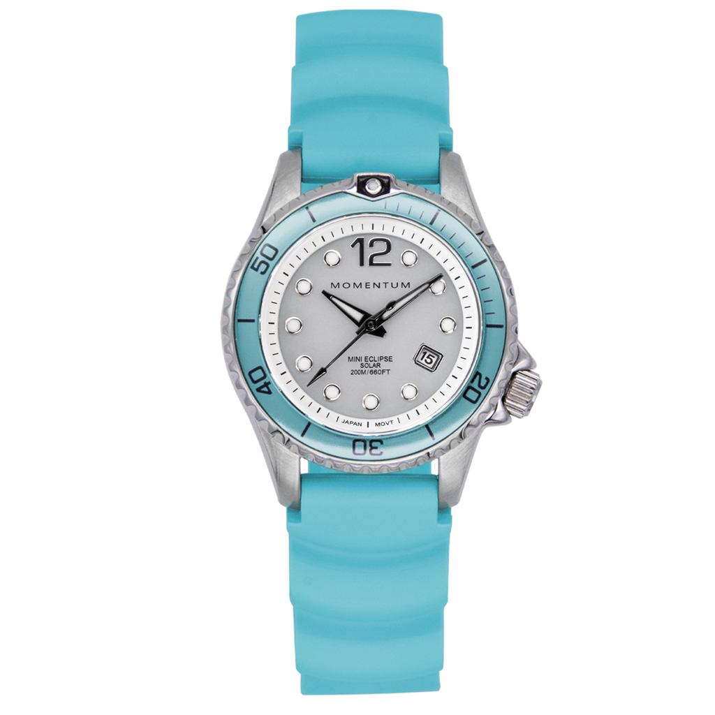 Add a pop of color to your style with one of our Mini Eclipse solar watches! The elegant case design is complimented by bright colors that give this watch a fun appearance in a package that boasts serious dive watch capabilities.