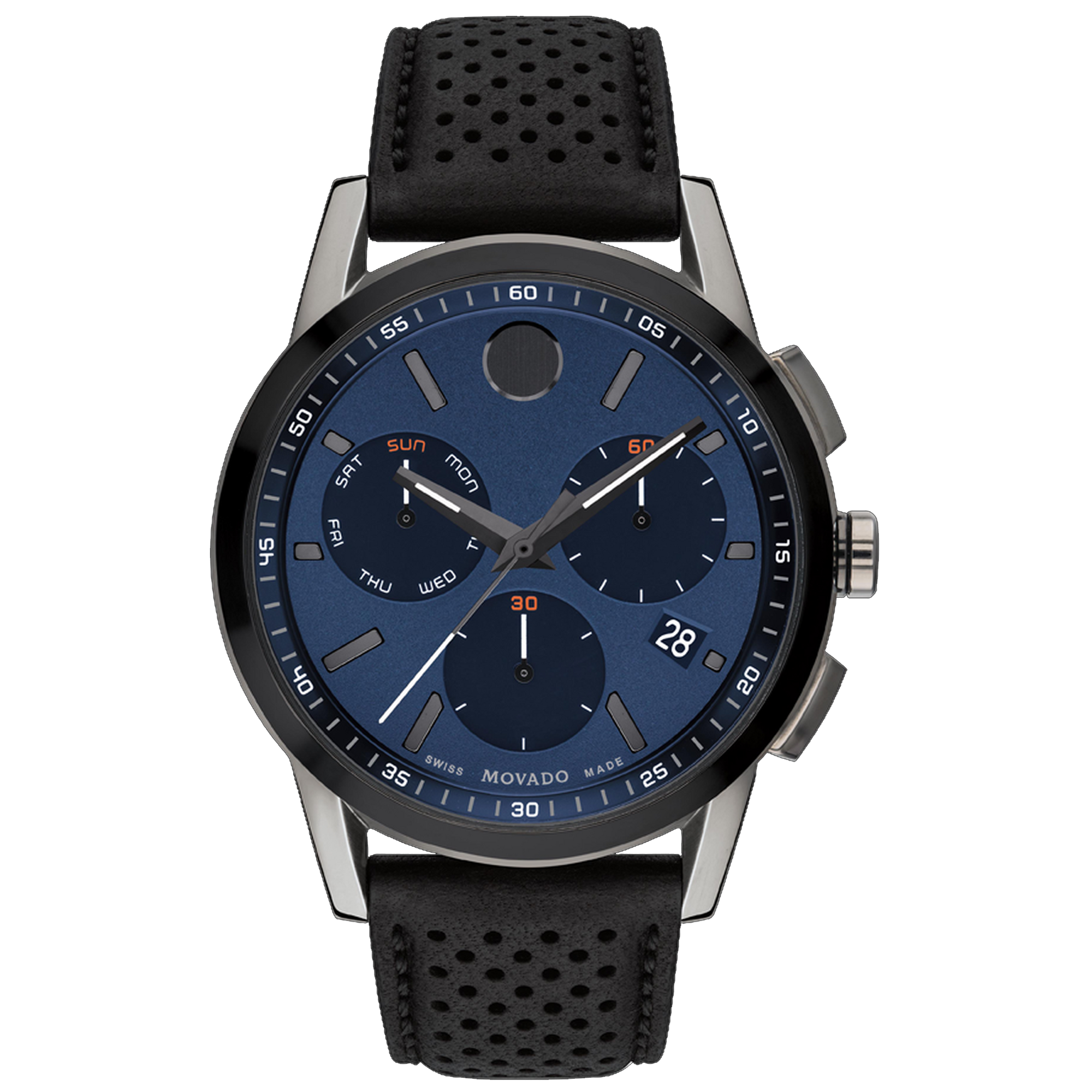 The Movado Museum Sport Chronograph is a masterful blend of elegance and functionality, designed for those who appreciate the fine craftsmanship and innovative design. This timepiece features a robust 43mm gunmetal PVD-finished stainless steel case with a sleek black PVD-finished bezel, complemented by a striking blue chronograph dial. Its visual appeal is further enhanced by a black perforated leather strap, offering both comfort and style. Boasting technical excellence, it includes a sapphire crystal fabrication for scratch resistance, water resistance up to 30 meters, and a precision movement wrapped in a genuine leather strap, making it an ideal accessory for the modern sophisticate