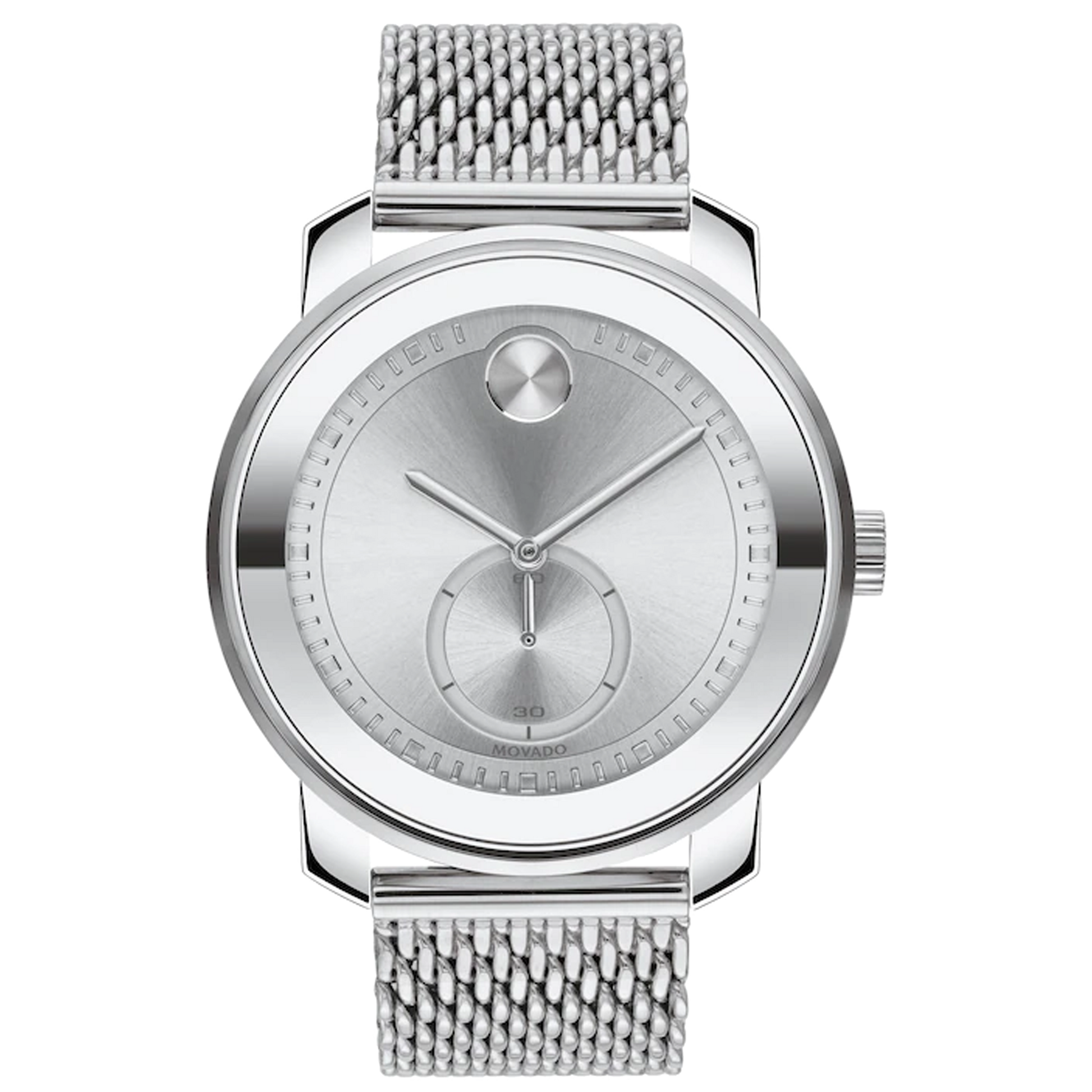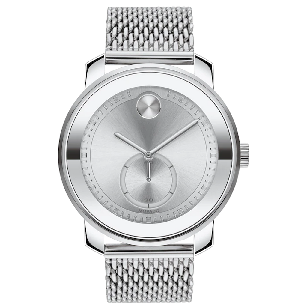 The Movado BOLD Sport men's watch has a 45mm stainless steel case and mesh bracelet with silver dial for a monochrome look. The bracelet secures with a sliding clasp.
