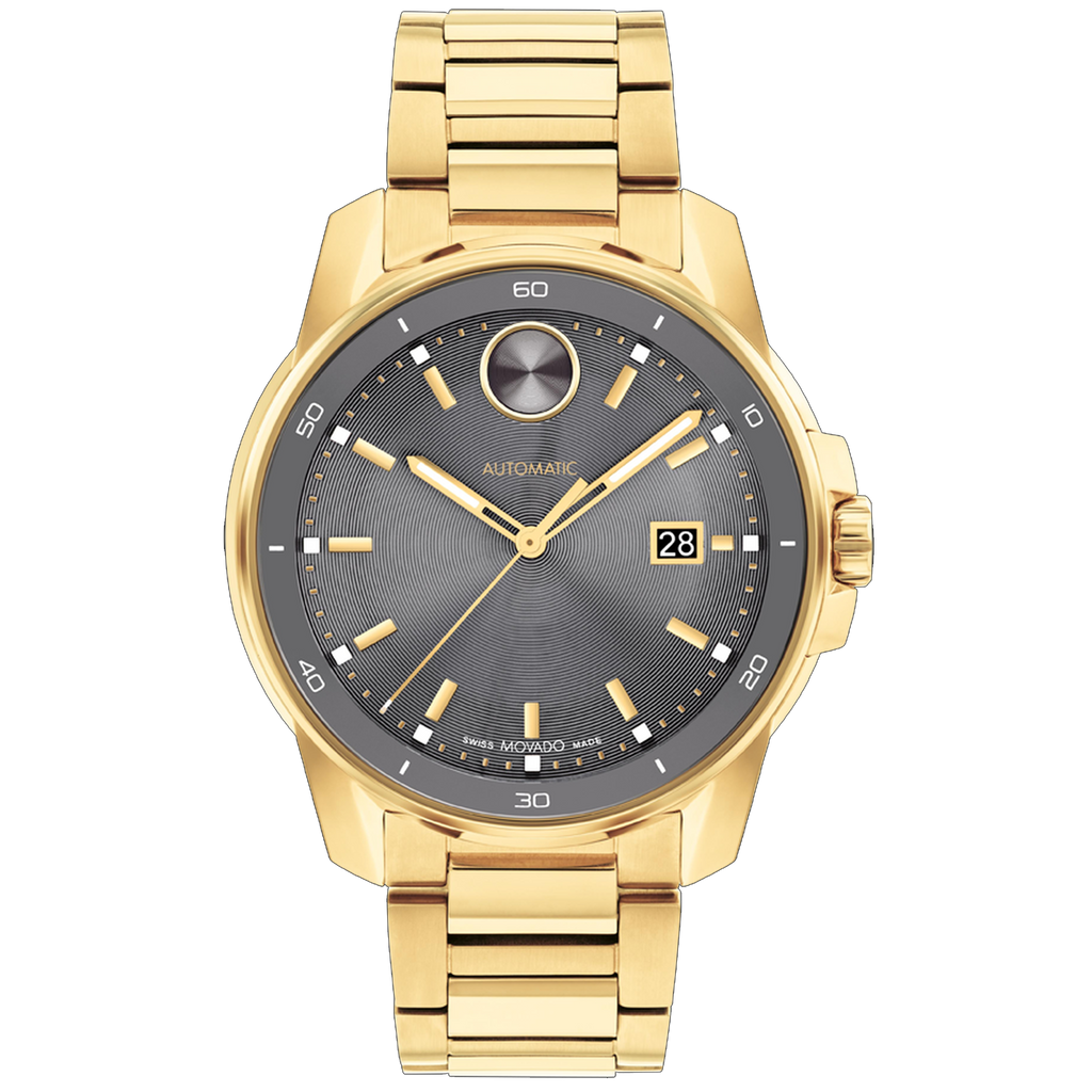 Sporty, ultra-modern design, powered by you. Crafted from gleaming yellow gold ion-plated stainless steel, this timepiece boasts a 43mm case, grey dial with a date window and Swiss Super-LumiNova® accents. This contemporary-cool design features a self-winding movement driven by the motion of your wrist with no need for batteries, displayed with an exhibition caseback. A matching yellow gold ion-plated stainless steel bracelet completes the design.
