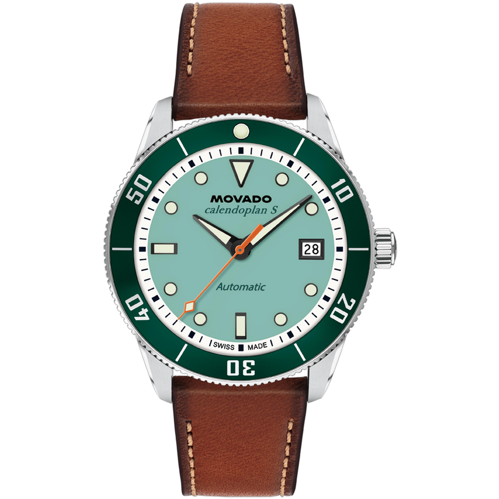 The Heritage Series Calendoplan S brings a modern twist to Movado's classic 1950s design, infusing it with a sporty flair. This 40mm timepiece is powered by a Swiss-made self-winding movement, activated by the motion of your wrist. It showcases an aqua lacquer dial, Swiss Super-LumiNova accents, and a green aluminum bezel, blending elegance with functionality.