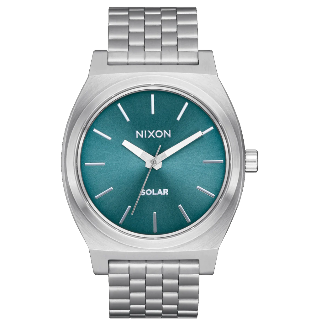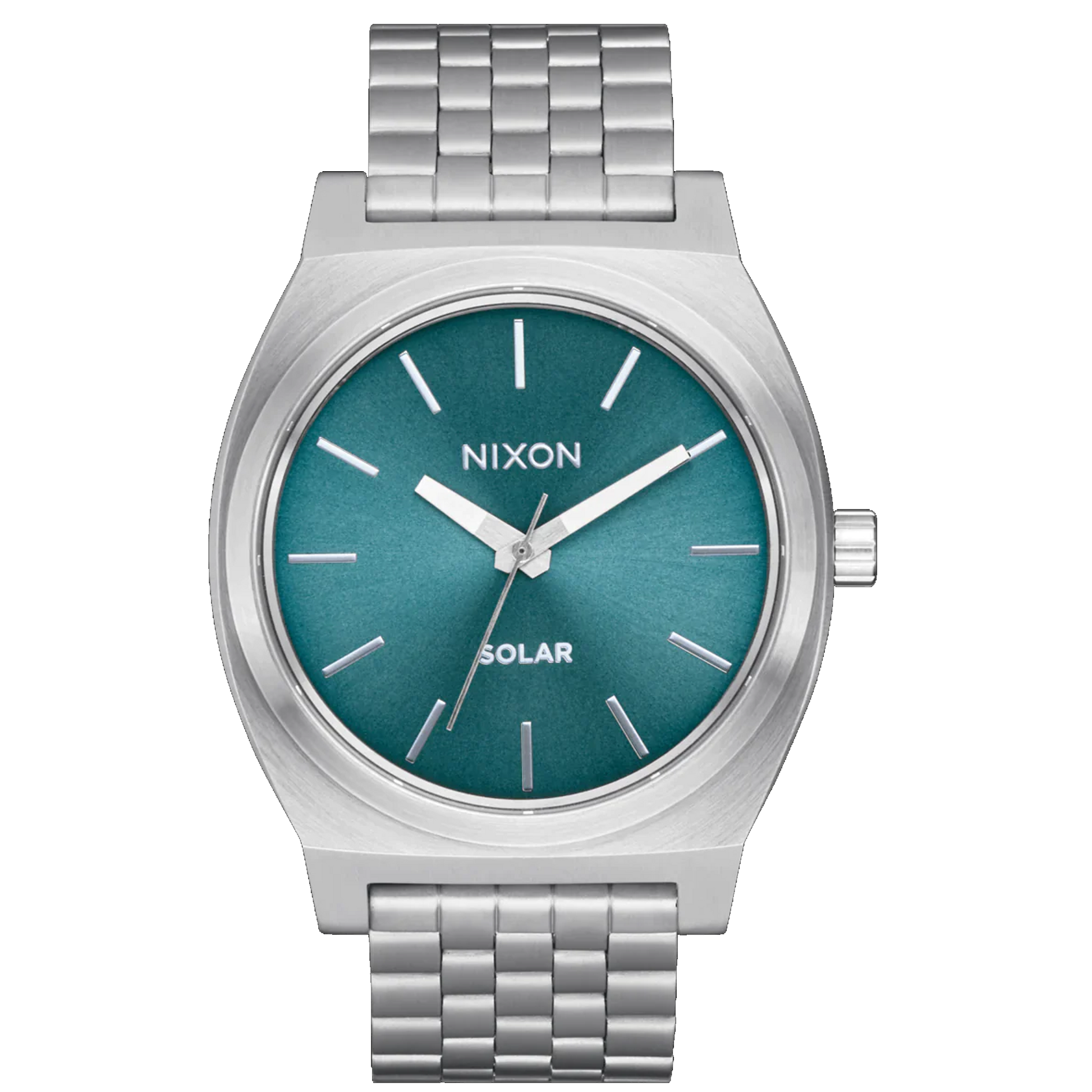 A true Nixon icon just got supercharged. Introducing the new Time Teller Solar. Built with the simple sophistication you know and love, the Time Teller Solar features a bigger case at 40mm, a new quick release 5-link bracelet with a deployment clasp that can be adjusted without a tool, and a 100m / 10 ATM waterproof rating. This watch is ready to make you look and feel good wherever you go.