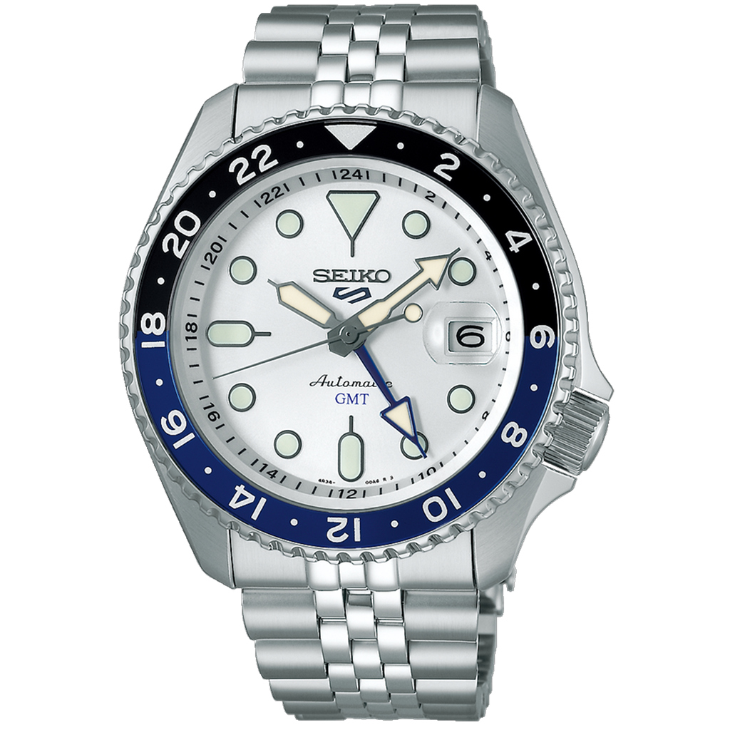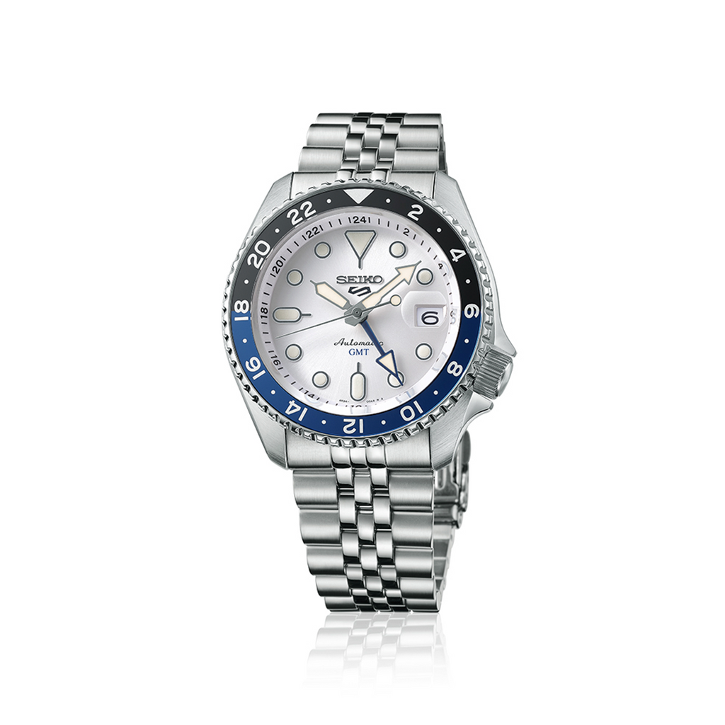 This SKX GMT takes inspiration from a popular archive colour scheme which captured the scene of the blue sky piercing through clouds. The combination of silvery-white dial with deep blue bezel is designed to resemble sunlight spreading its glow throughout the sky whilst its GMT function tracks multiple time zones.