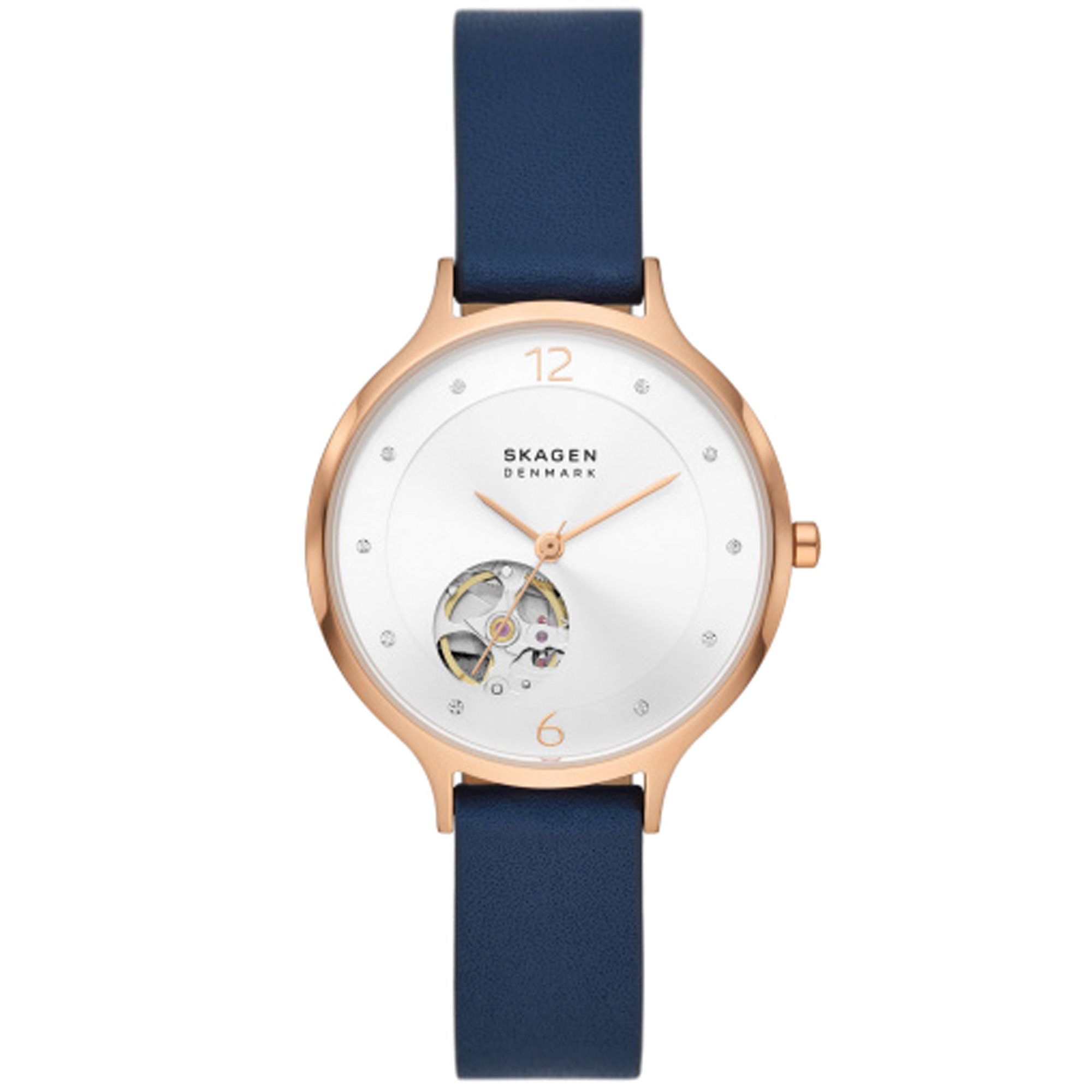 This Skagen Anita 36mm watch features a stainless steel case and rose gold tone, with a white silver dial and 3 ATM water resistance. The automatic three-hand movement provides precise time keeping, and the interchangeable 14mm leather strap in ocean blue adds an elegant touch. With crystal mineral protection and a single prong strap buckle, this watch is perfect for any occasion.