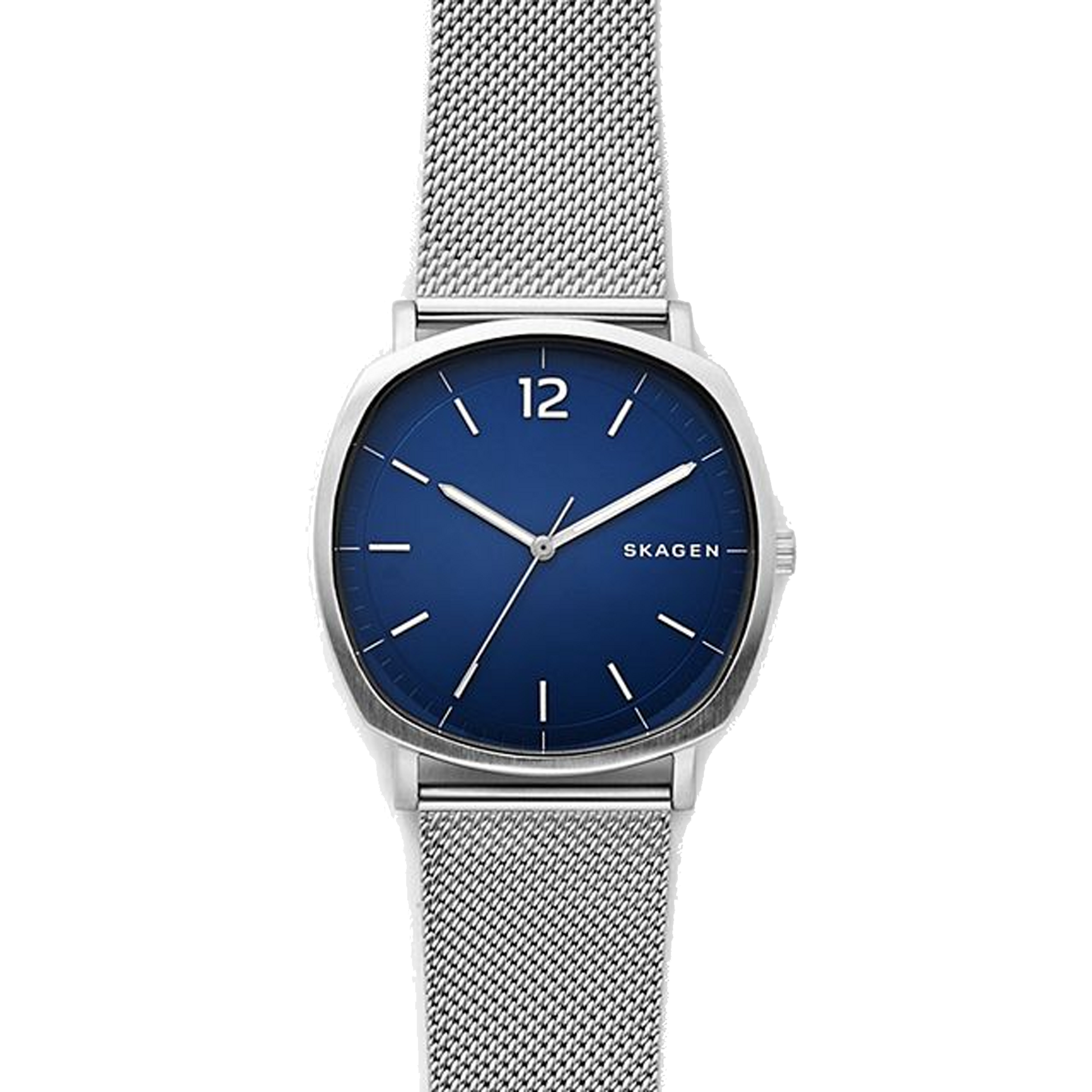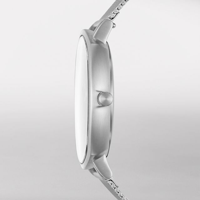 This 40mm Rungsted is set within a soft square case. It features a sandblasted dial with three-hand movement and linear indexes. A quick-release pin construction makes it easy to interchange the steel-mesh strap with any 22mm standard strap.