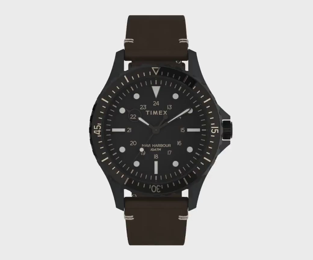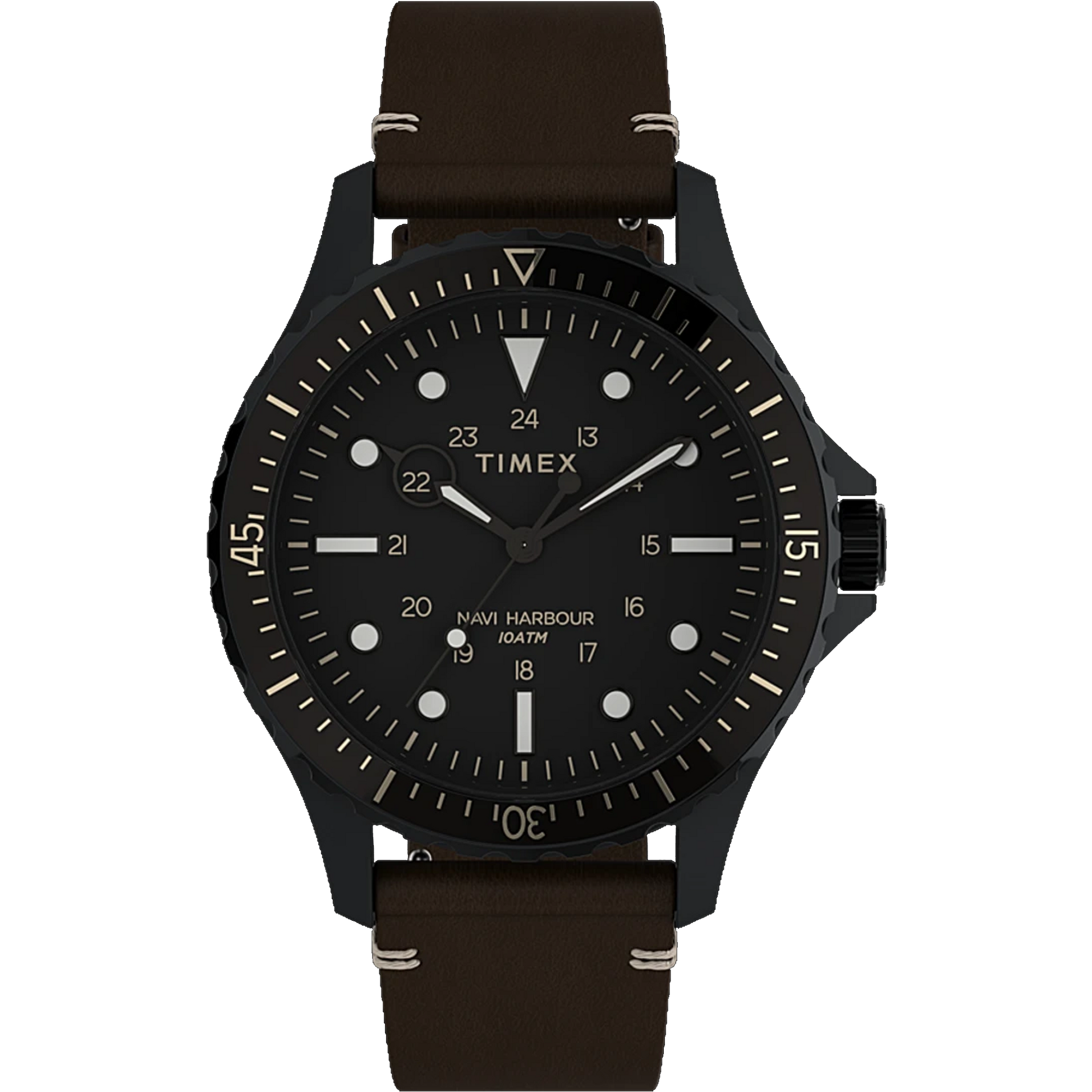 The best inspiration is always found while searching the archives. Timex's Navi XL pulls its design influence from the earliest diver-style watches. The 41mm black stainless-steel case with a rotating top ring, black dial, and smooth, brown natural leather strap with side stitching provides a modern take on this vintage design.