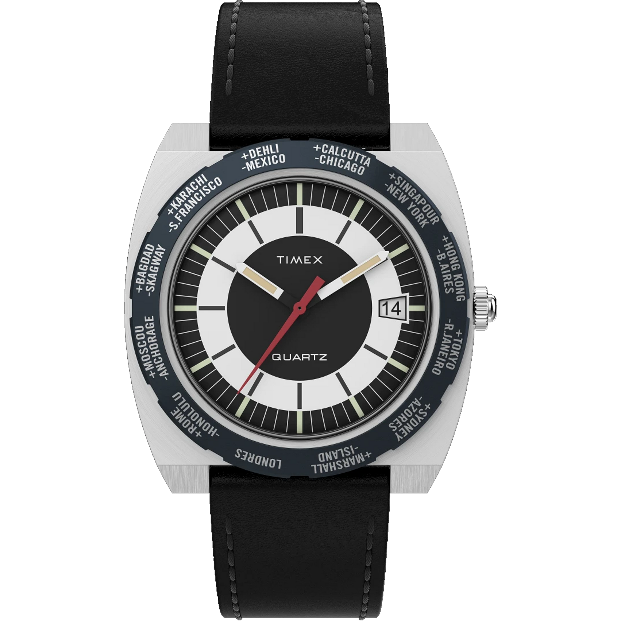 The Timex World Time 1972 Reissue brings a unique 1970s design from the Timex archive back to life for 2023. Originally created for stylish travelers in the golden era of jet-setting, its rotating bezel marks Greenwich Mean Time and follows with names of 23 cities around the globe, making it easy to read the time in any time zone at a glance. This style, created for the European market, features the French spelling for the noted locations.