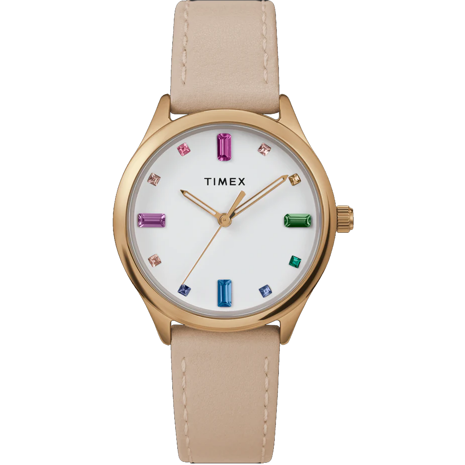 With an exquisite 32mm case profile, the presentation of this women's dress watch is a sight to behold. A beautiful dial with crystal indices and leather strap give this timepiece an air of elegance, although you can rest assured that design and execution aren't the only areas in which it shines. Its 50-meter water resistant rating offers yet another reason to wear this sophisticated timepiece around the clock.