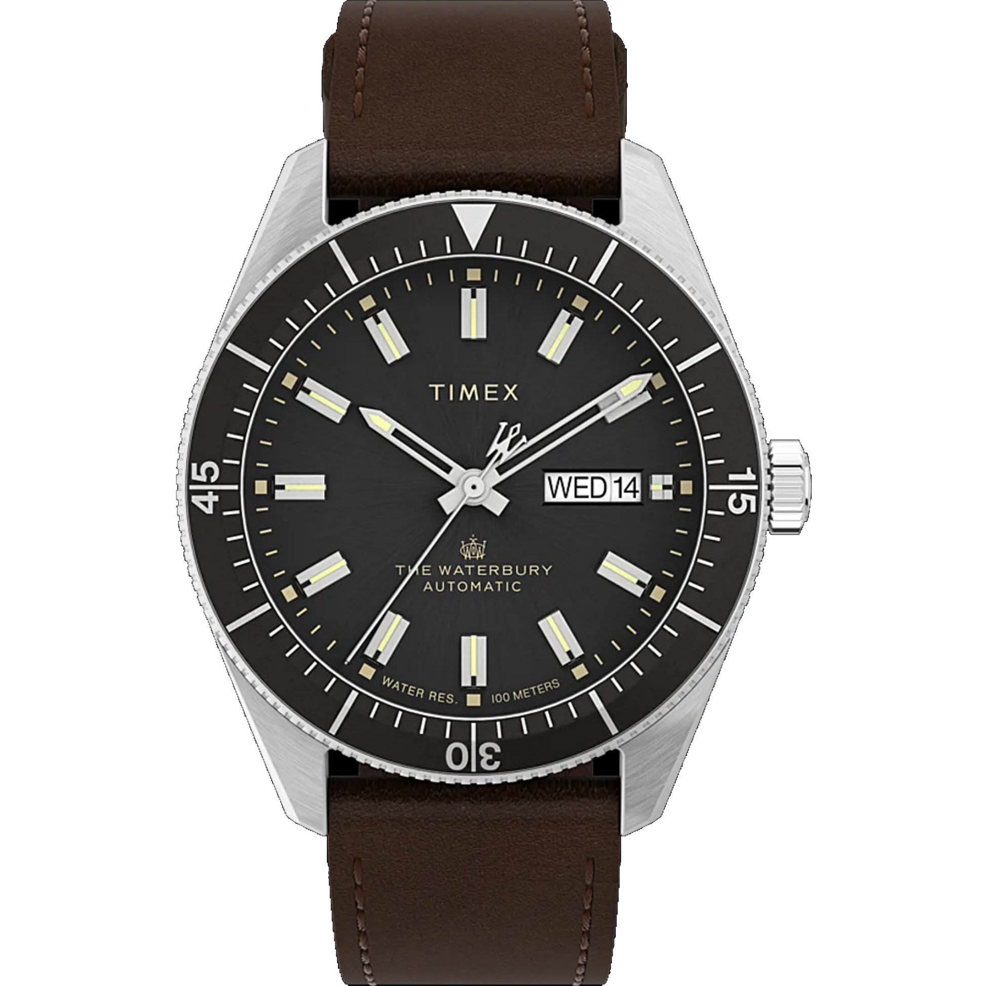 Influenced by the purpose-built timepieces of the mid-twentieth century, the dive-inspired Waterbury Dive Automatic beckons to adventure on land and sea. A rotating top ring brings practicality and vintage appeal to its refined design aesthetic—a feature traditionally used to track elapsed time beneath the waves. They’ve paid homage to the original watch collection by using the iconic Waterbury Watch Company logo on the black sunray dial, crown, and sweeping second hand—which bears the stylized W—while finely finished surfaces display our attention to craftsmanship and detail. Powering this watch is a 21-jewel automatic movement that can also be hand-wound at the crown, creating a timepiece that’s packed to the gills with robustness and accuracy.